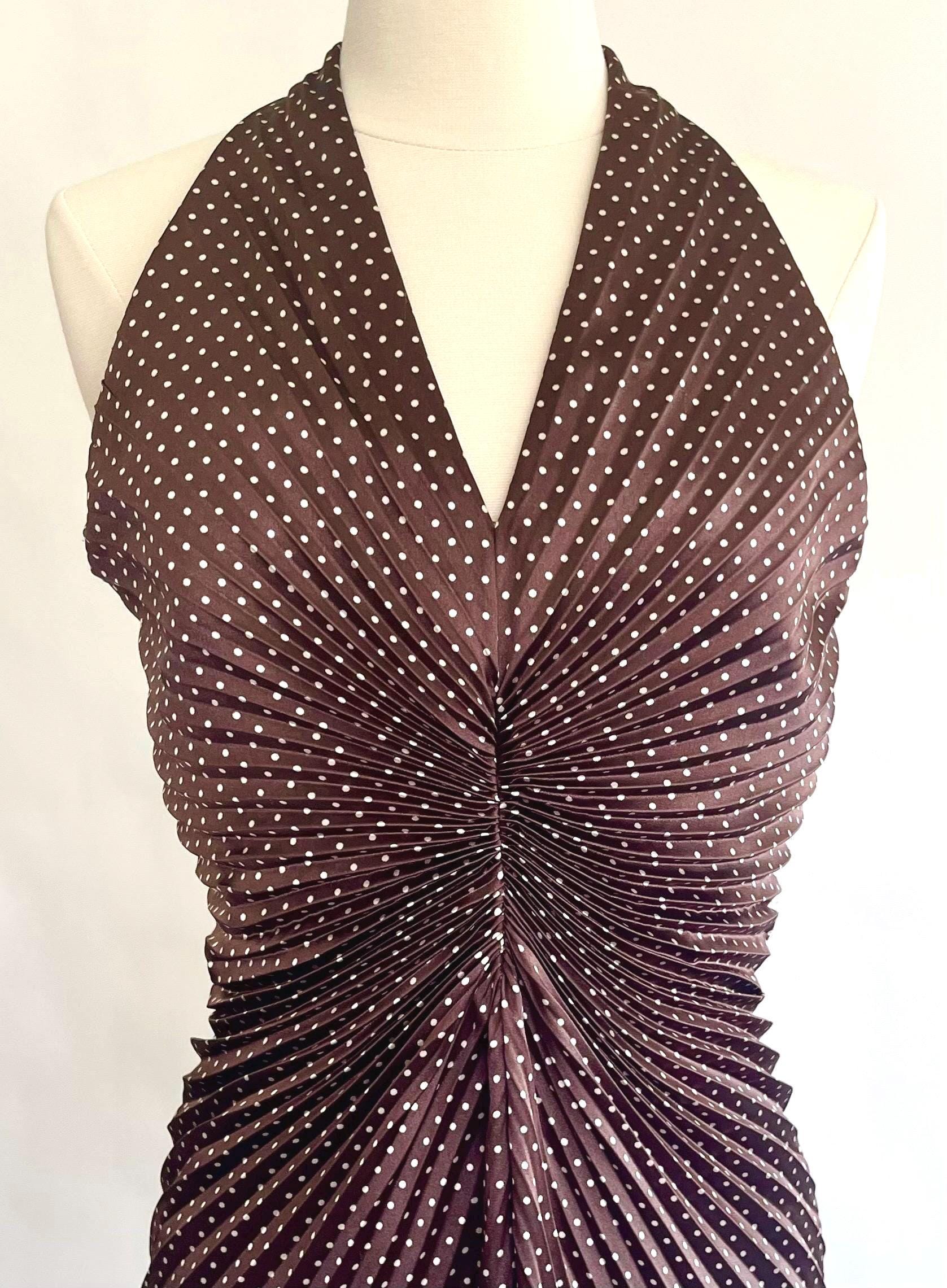 Vintage 90's Joseph Ribkoff brown and white polka dot print halter neck dress with flattering pleat detail at waistlin