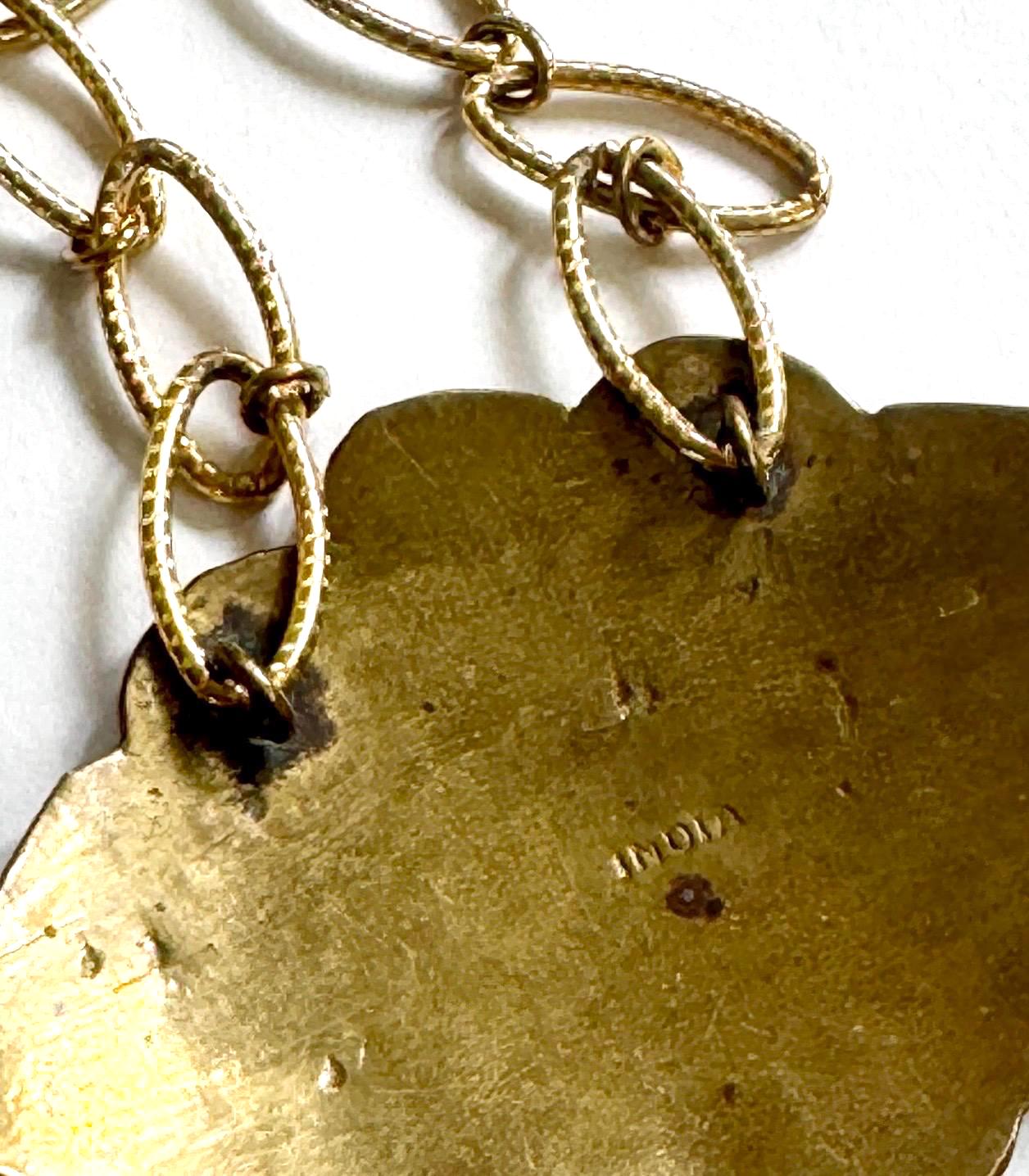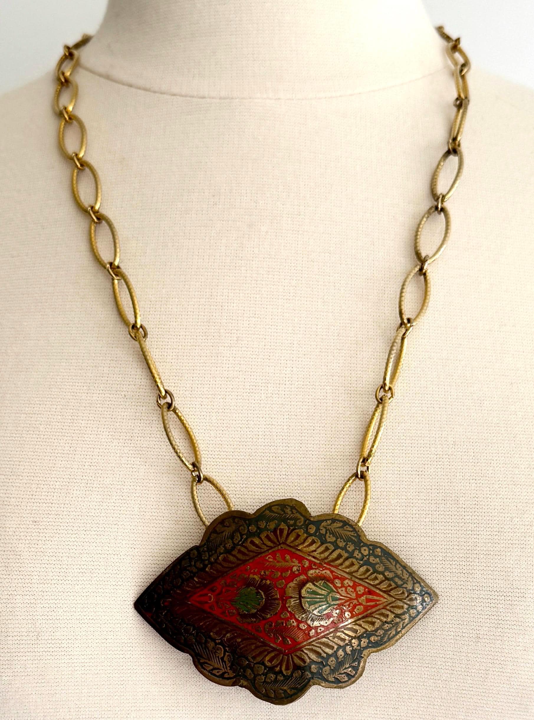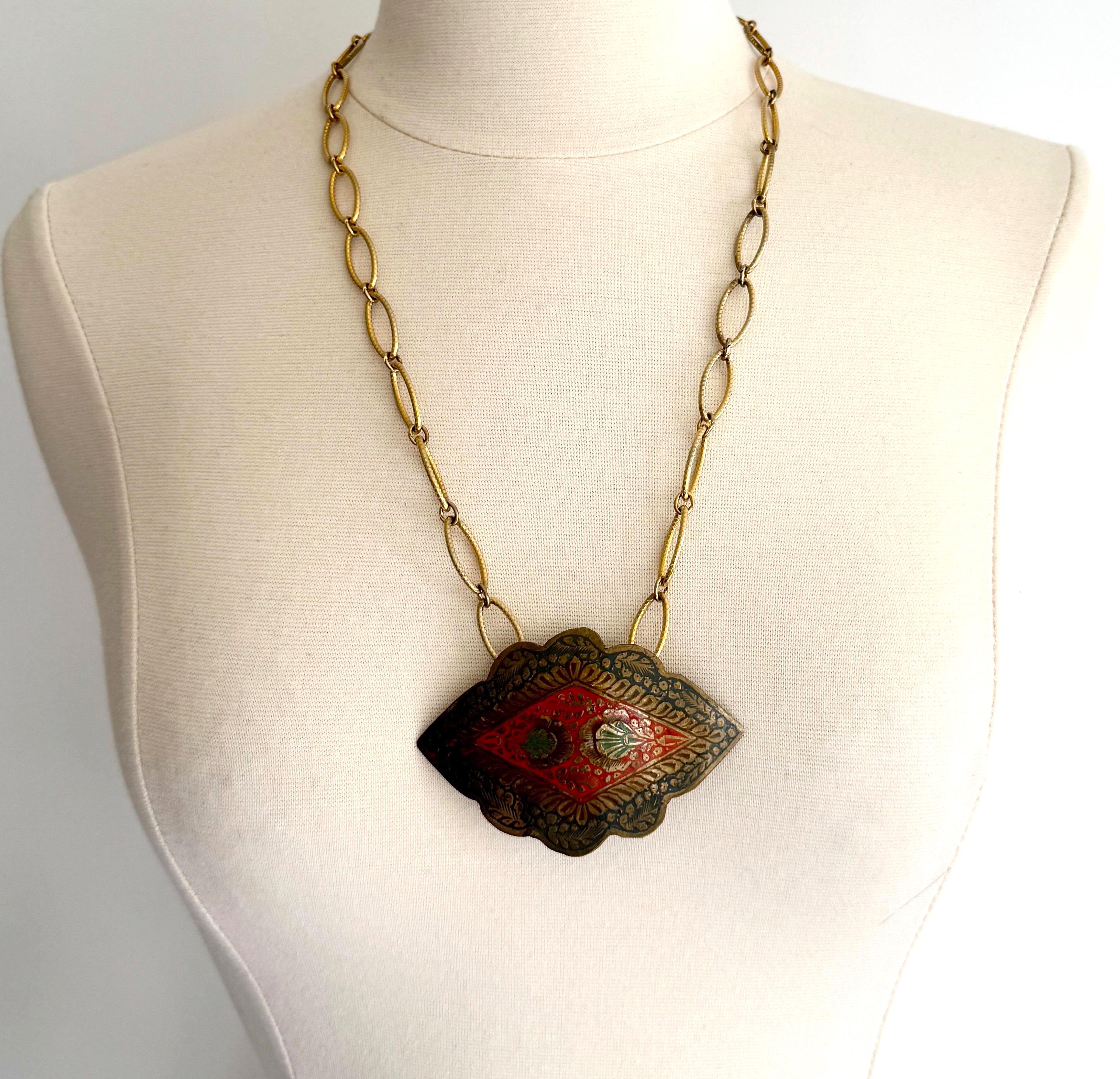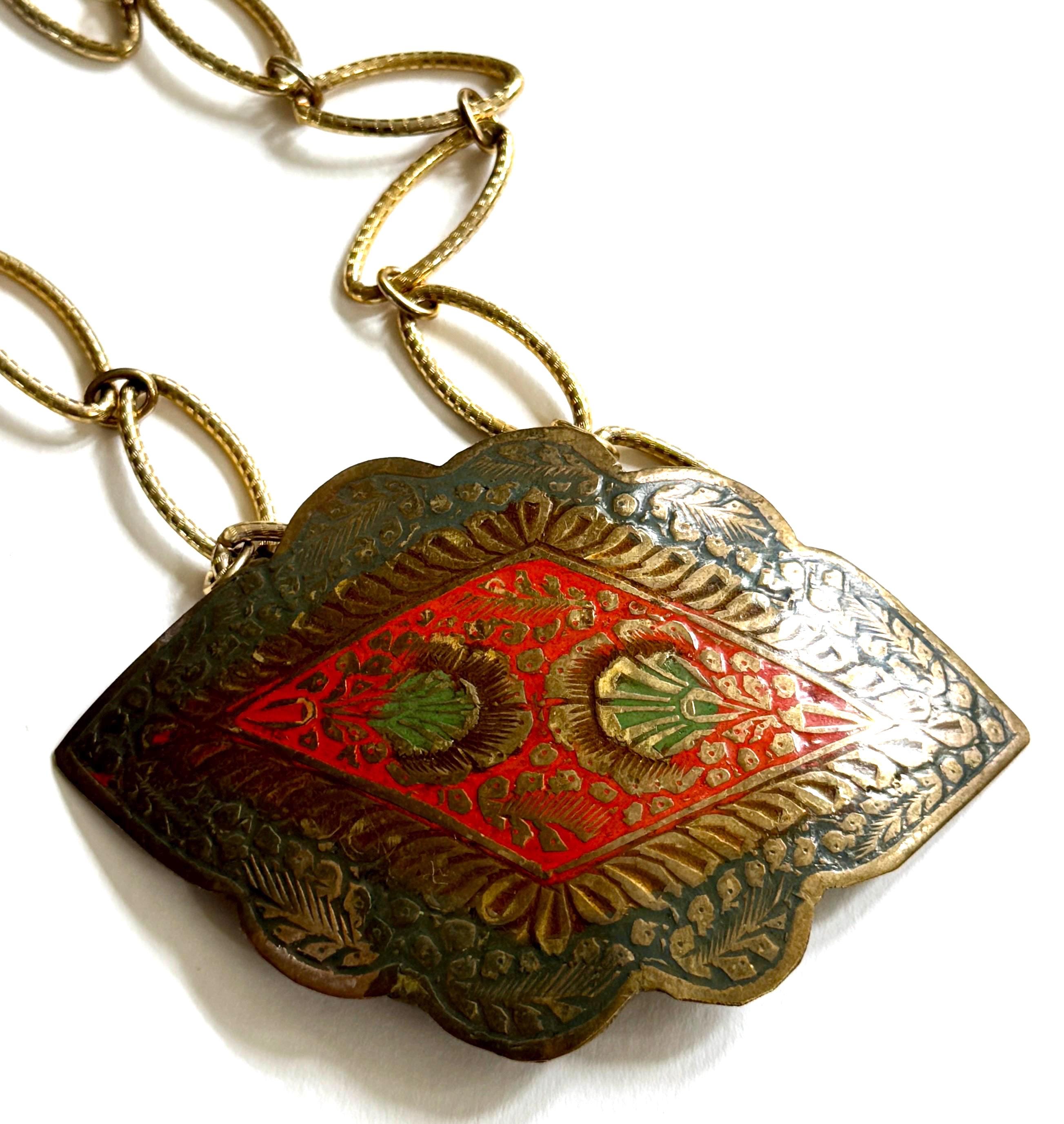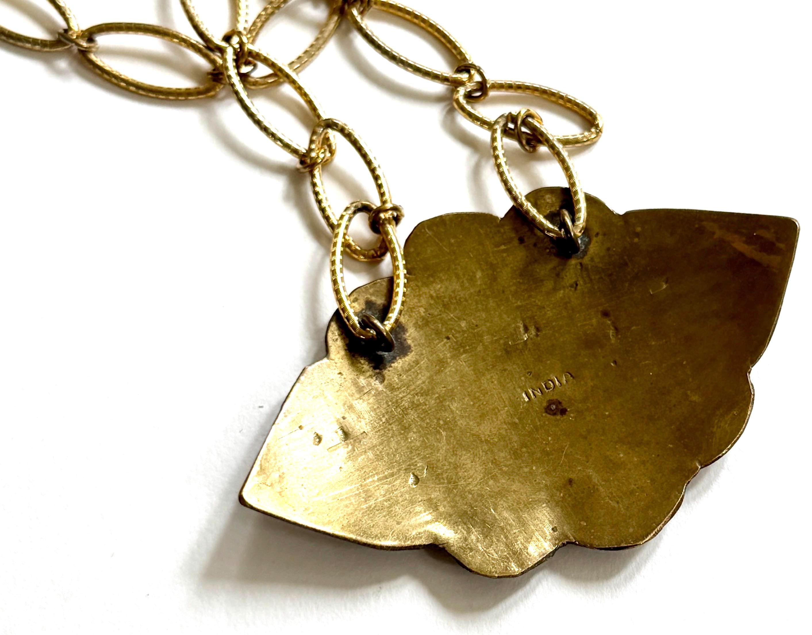 Vintage 70’s enameled Indian brass necklace strung on a gold tone link chain