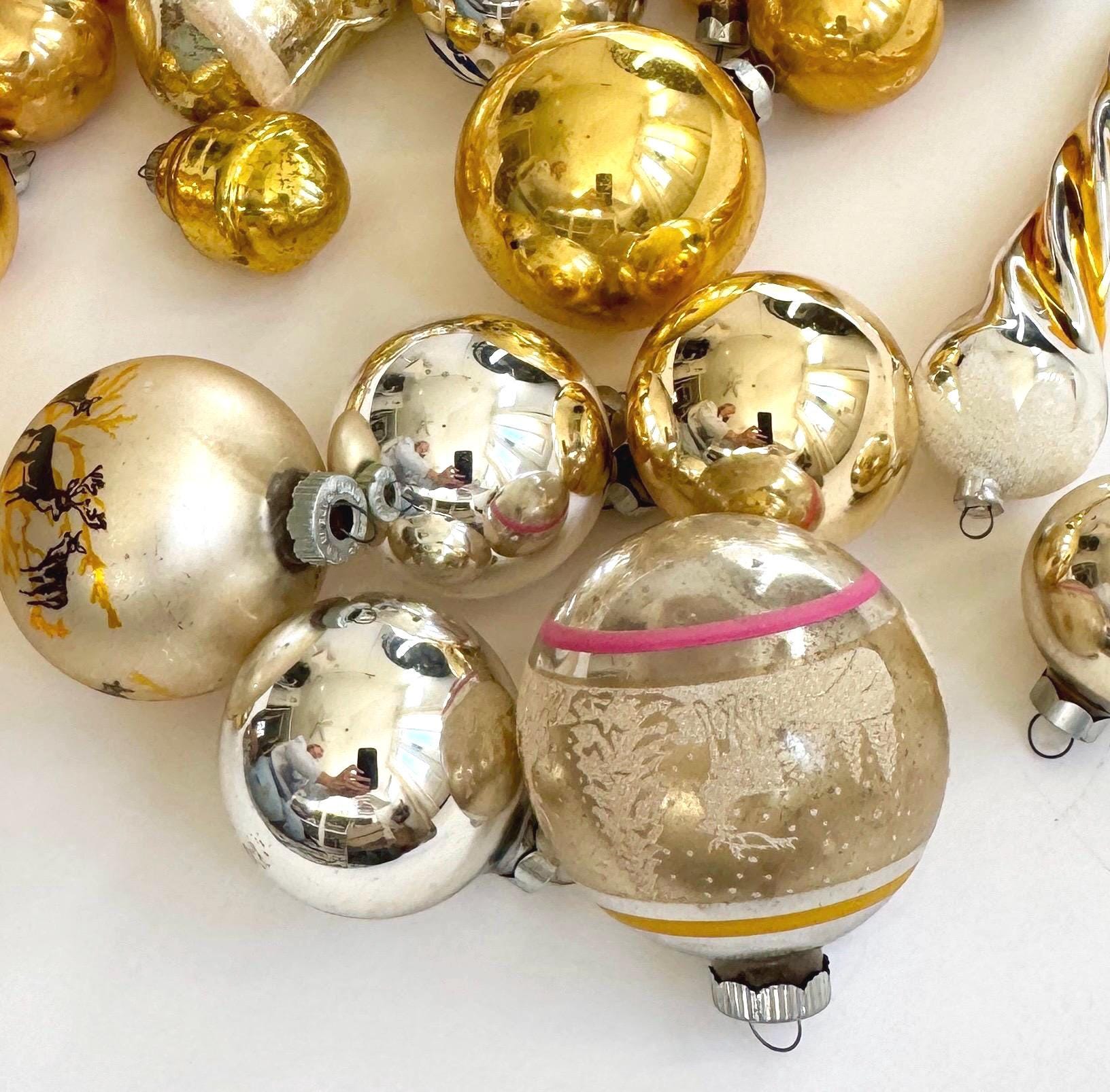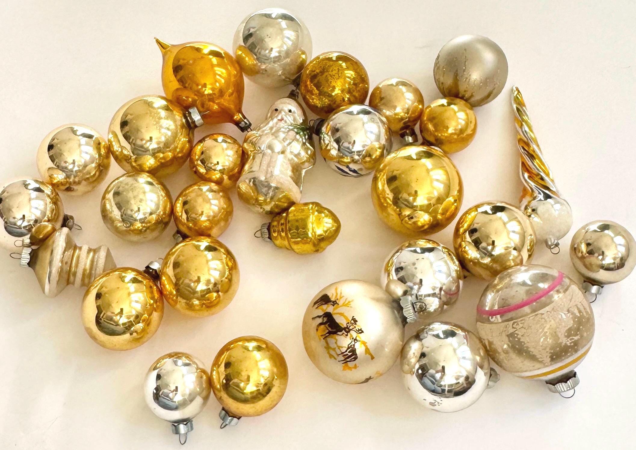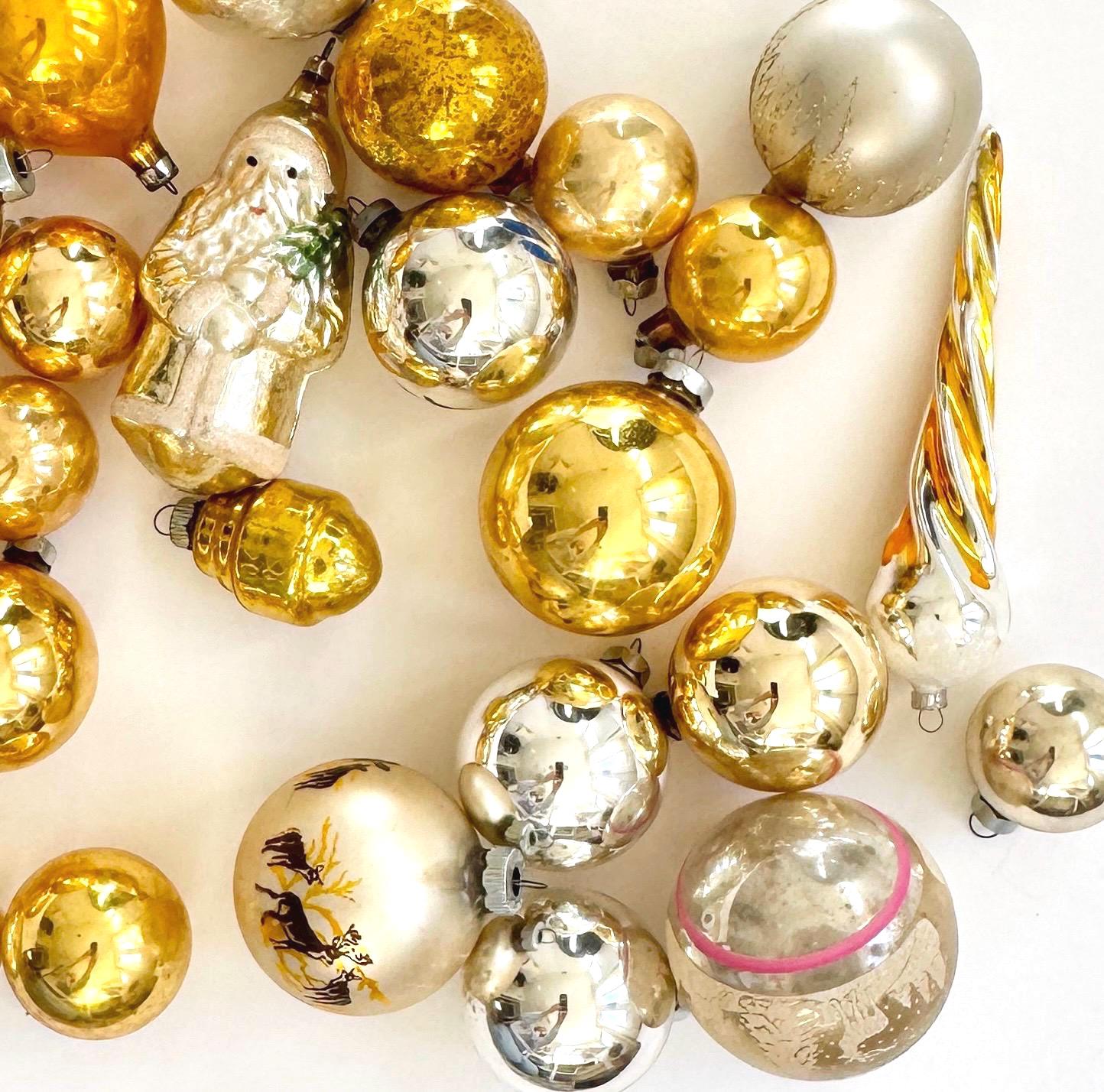 Mixed lot of 28 vintage glass ornaments in shades of silver and gold