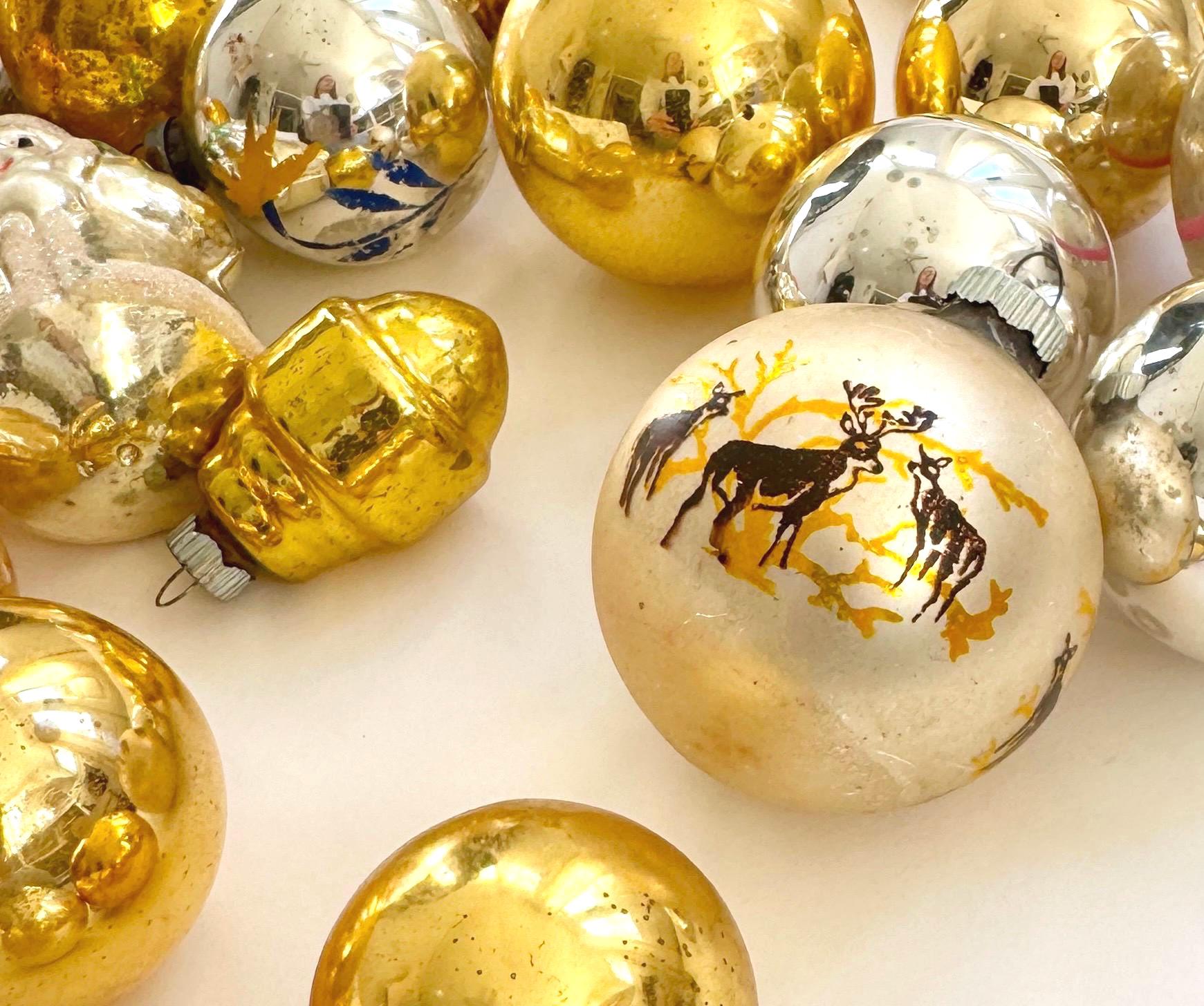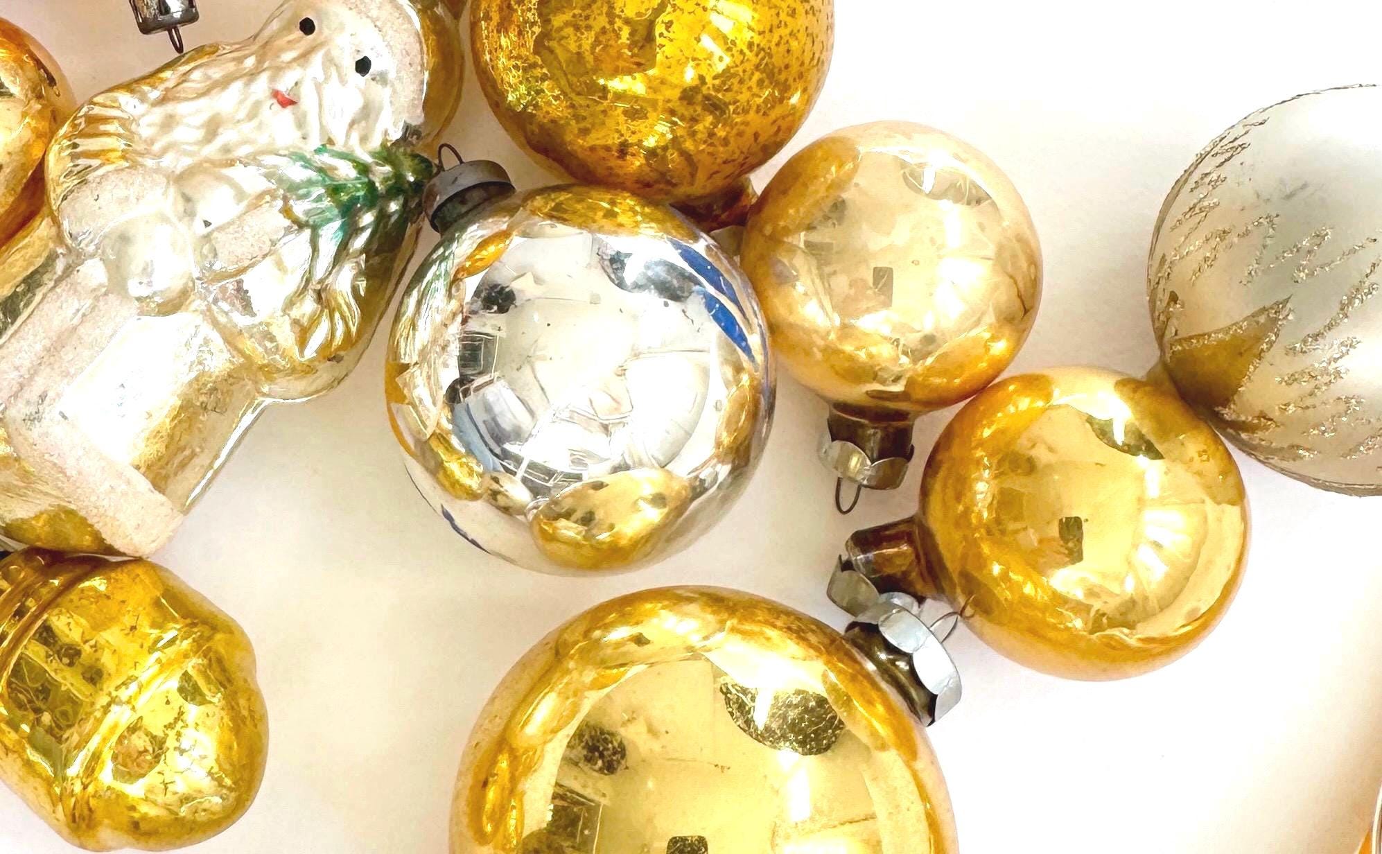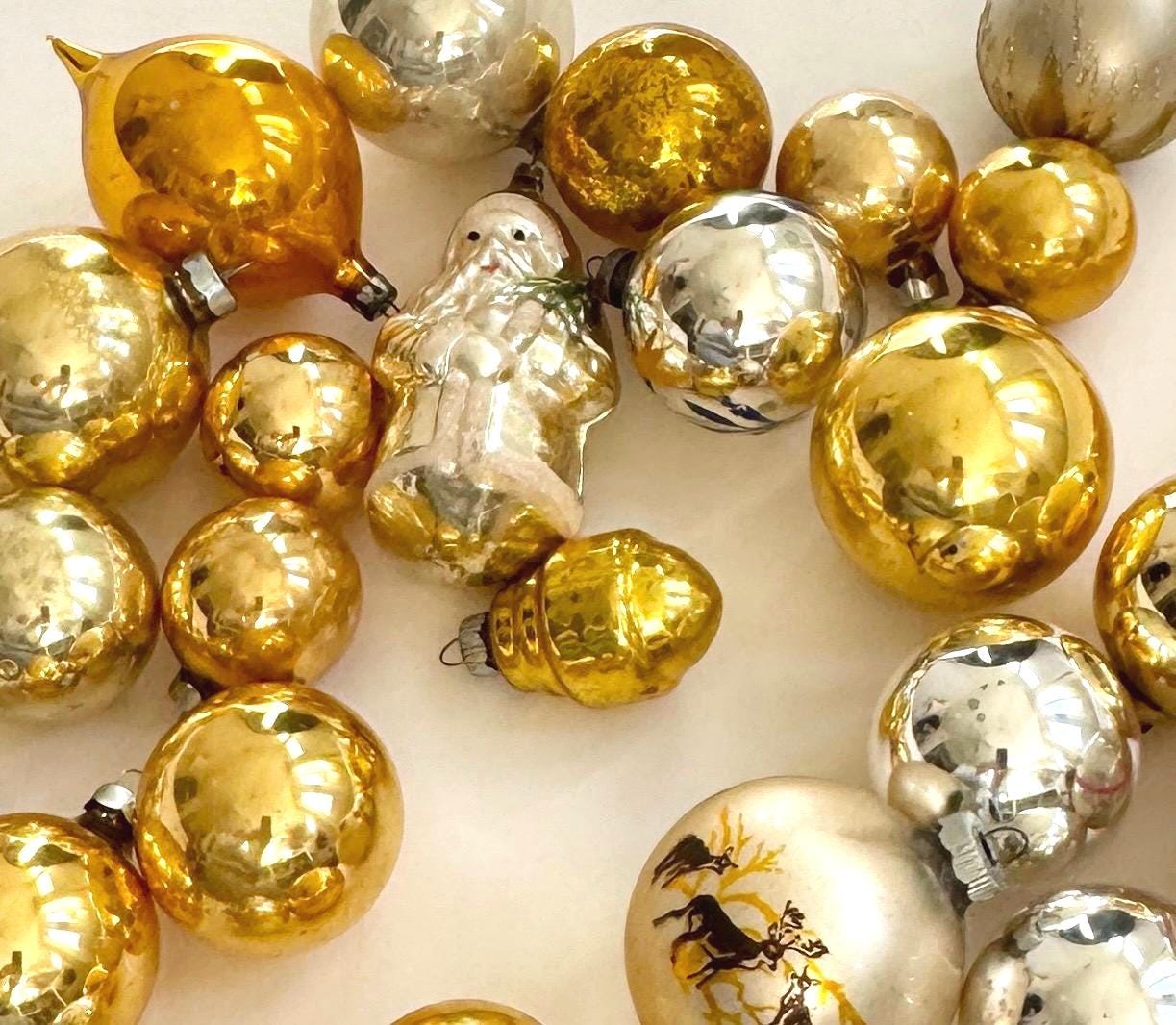 Mixed lot of 28 vintage glass ornaments in shades of silver and gold