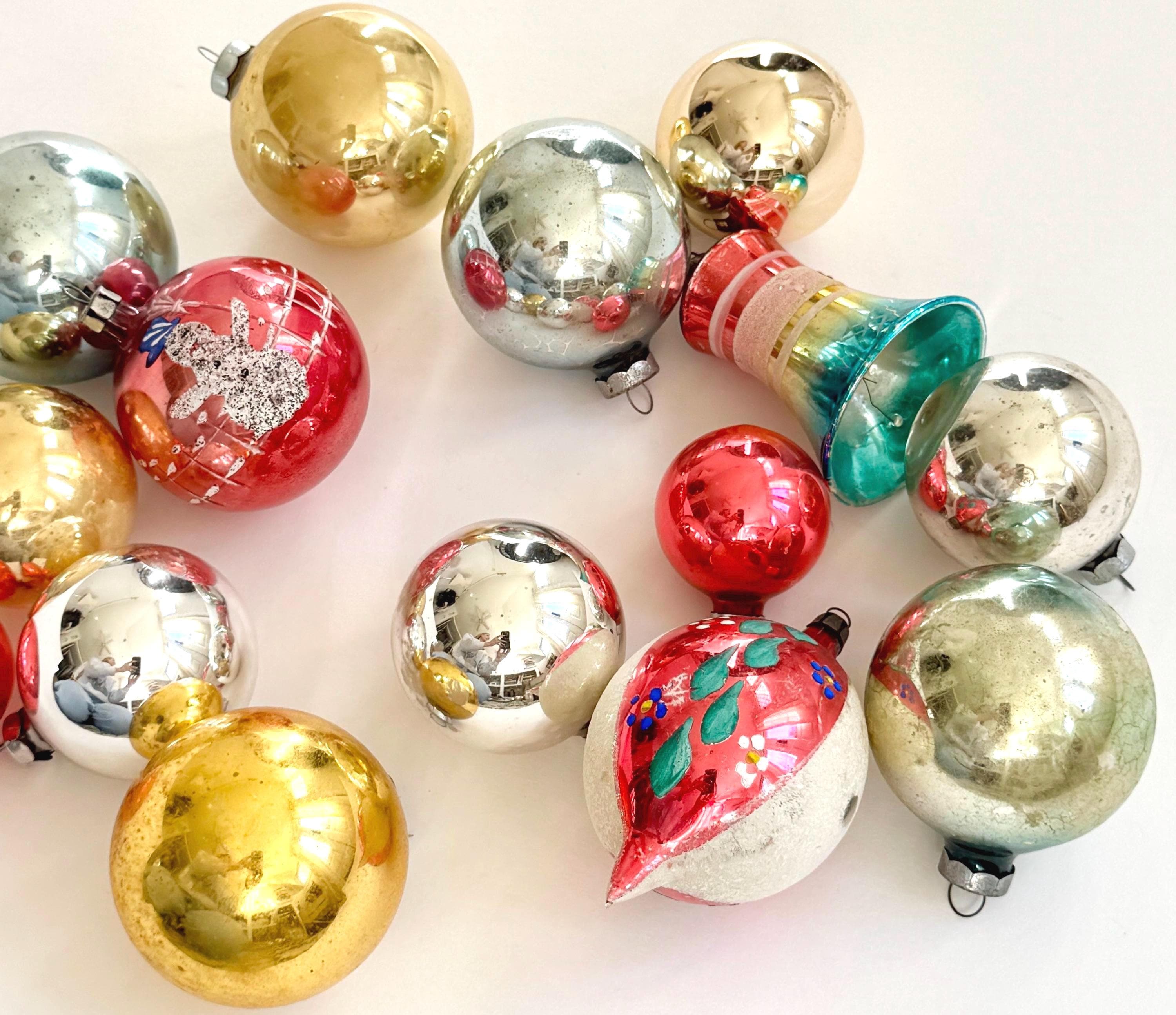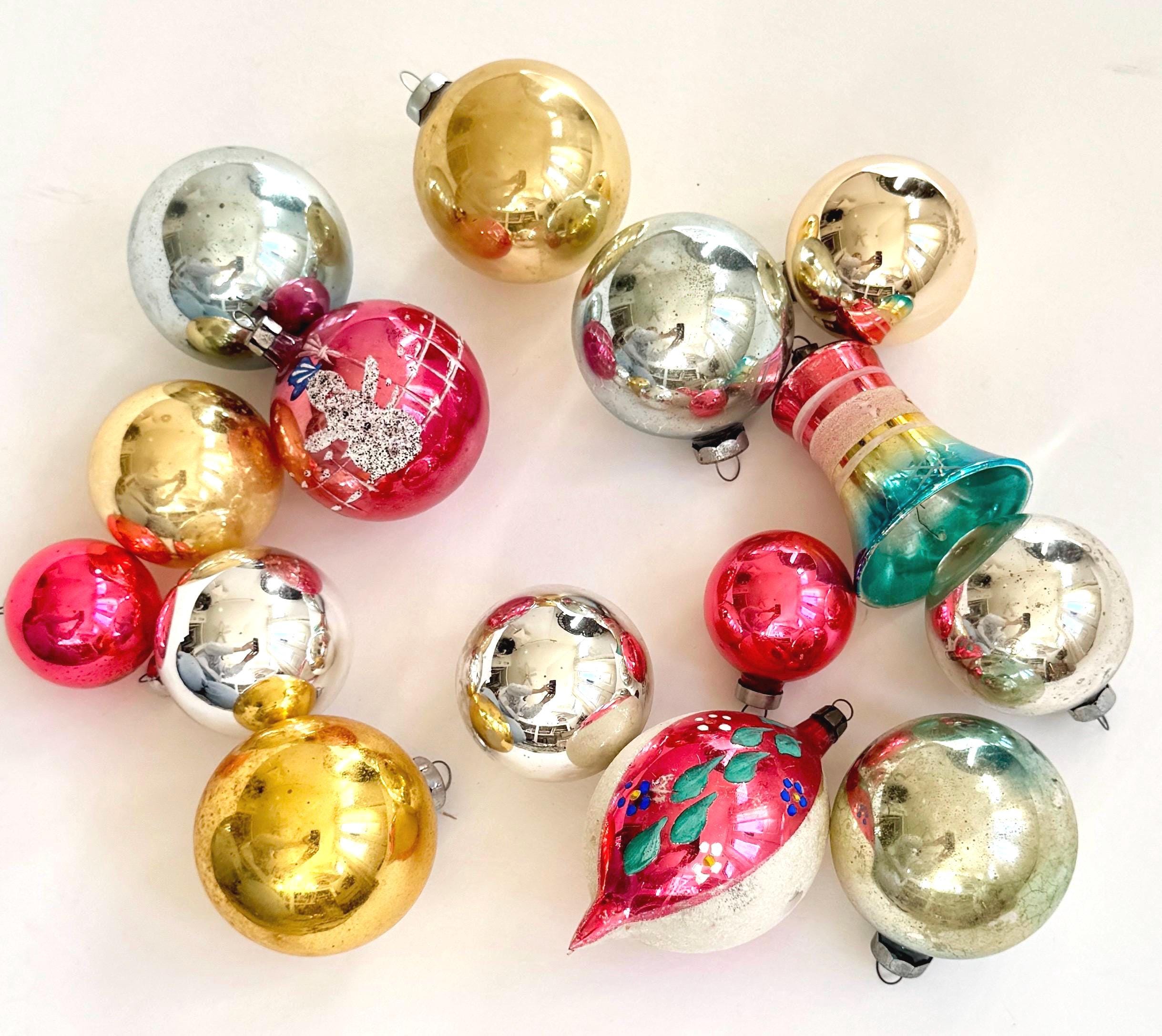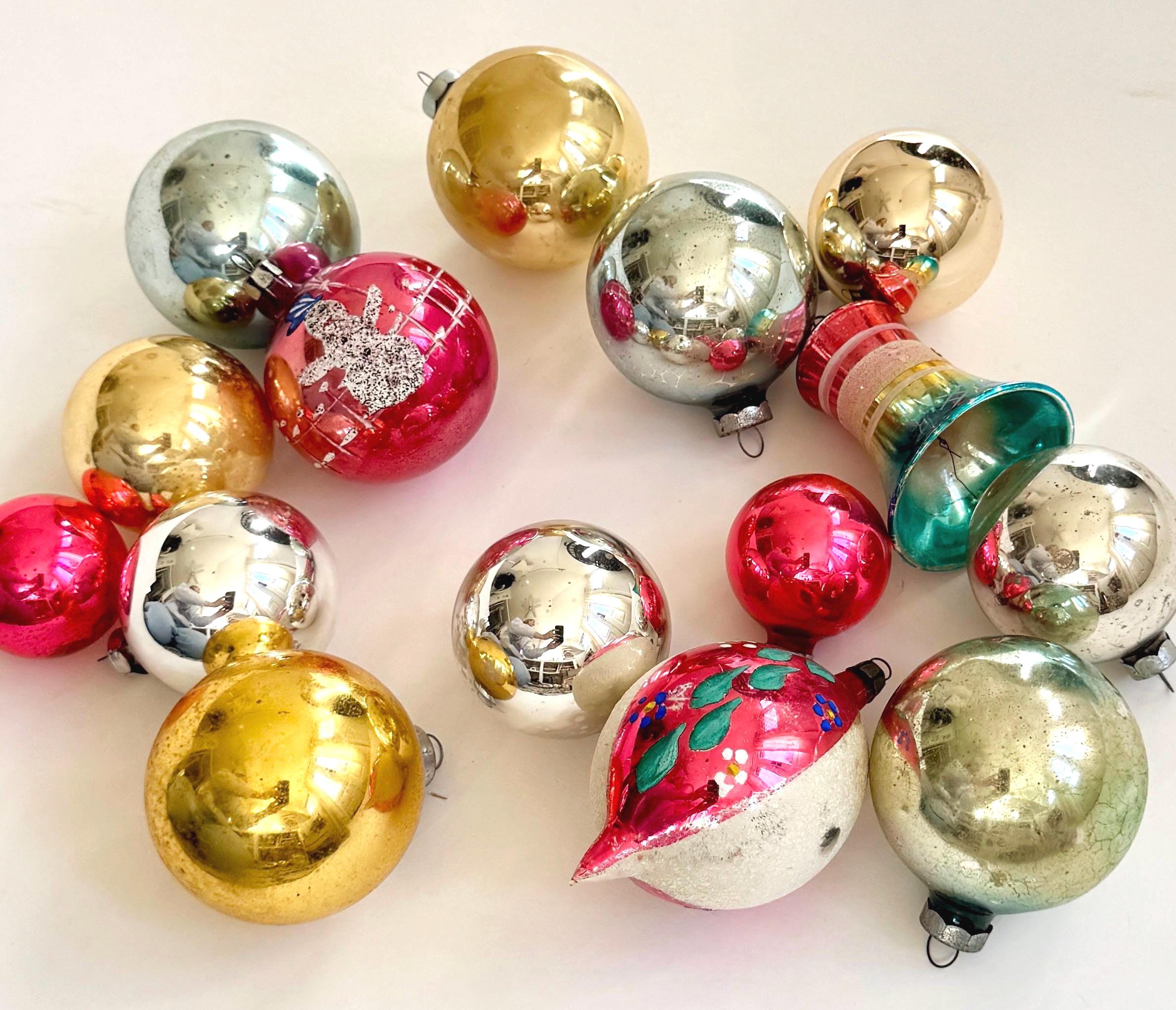Mixed lot of 15 vintage glass ornaments in shades of pink, aqua, silver & gold