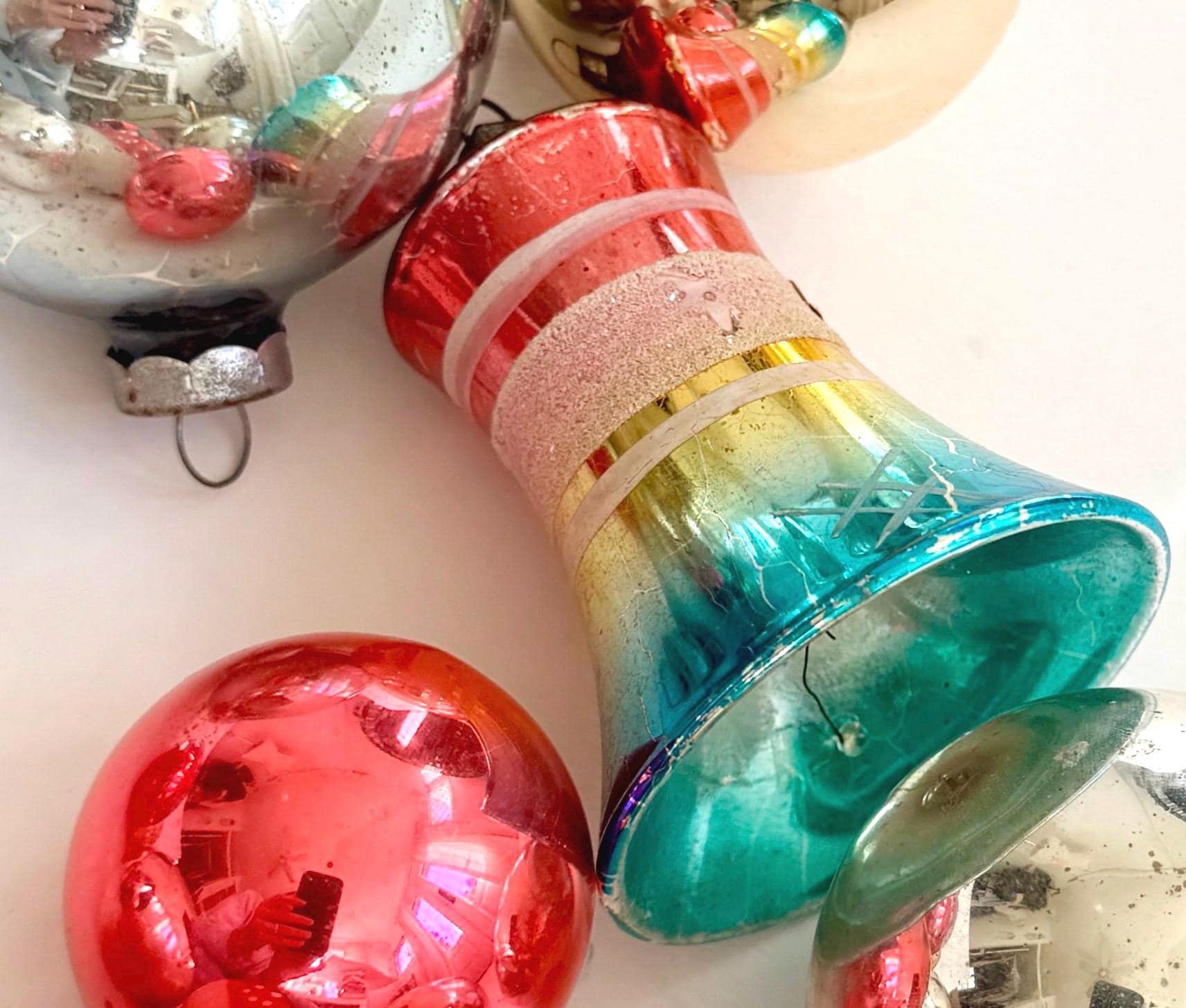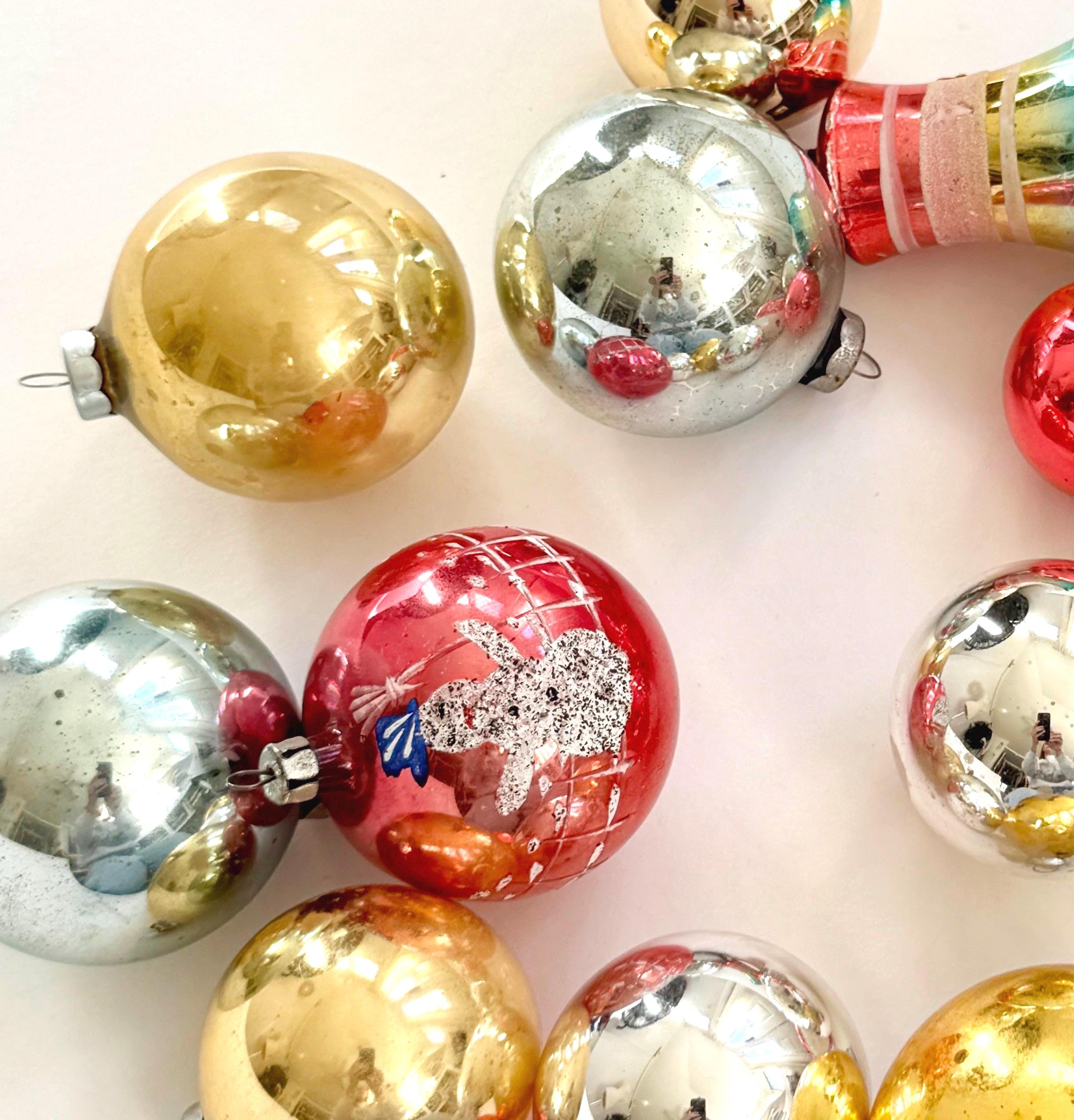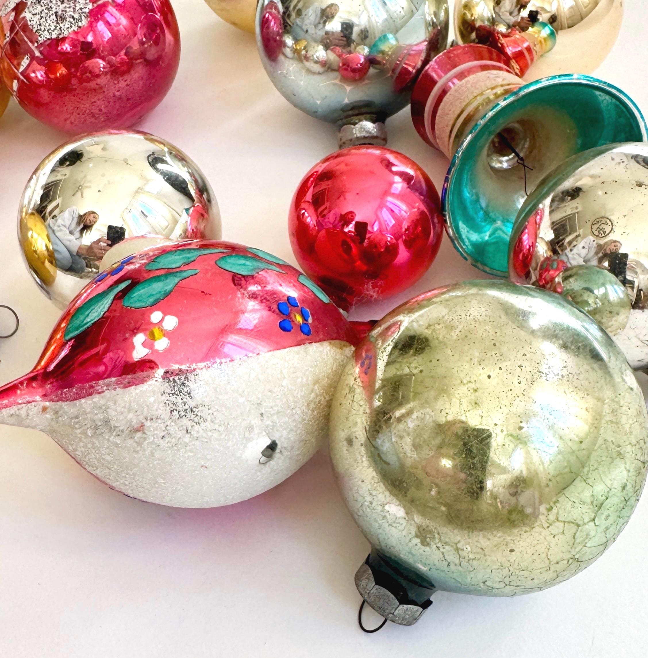 Mixed lot of 15 vintage glass ornaments in shades of pink, aqua, silver & gold