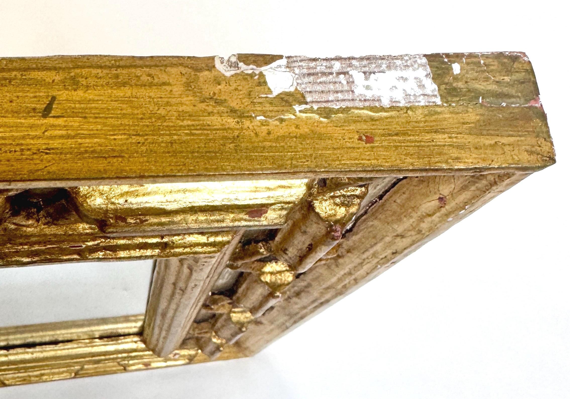 Good vintage condition with aged patina, dings, scratches, etc. in gilt finish. Glass has areas of dark scratches and discoloration. Frame sides have quite a bit of wear. See last four photos for close ups.