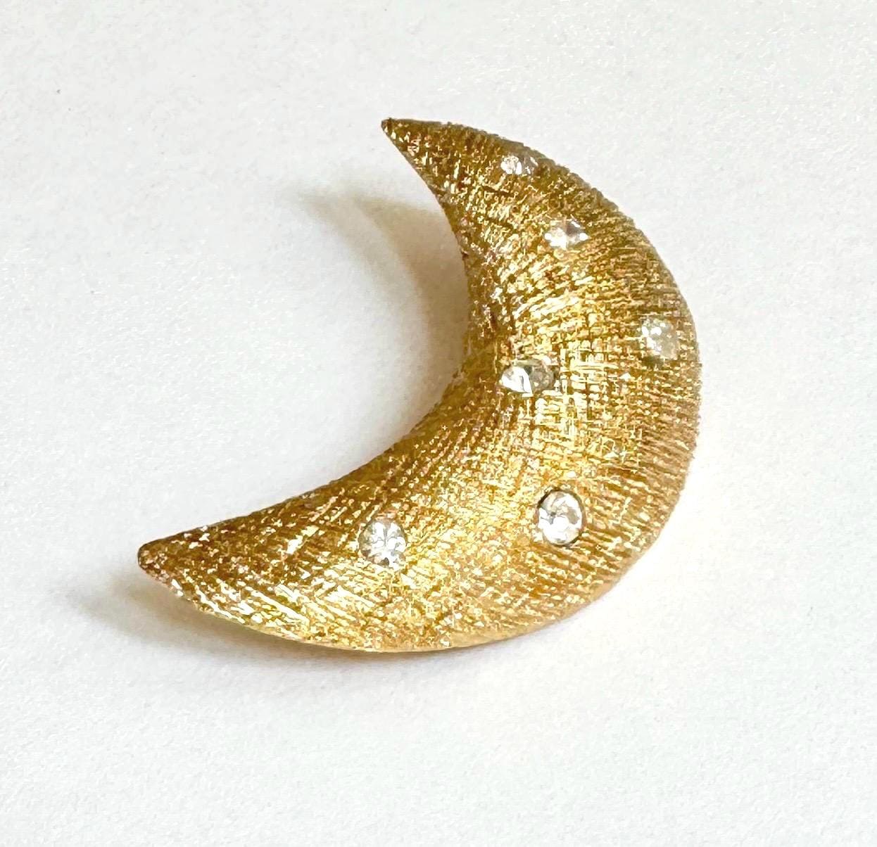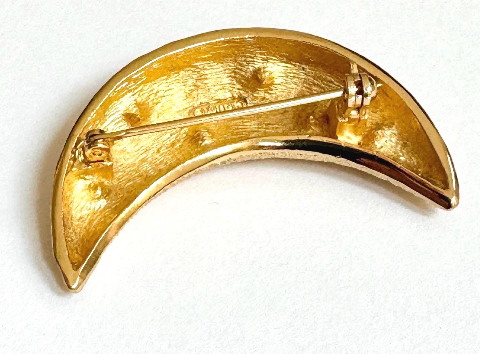 Vintage 80's Christian Dior textured gold tone moon brooch with clear crystal accents