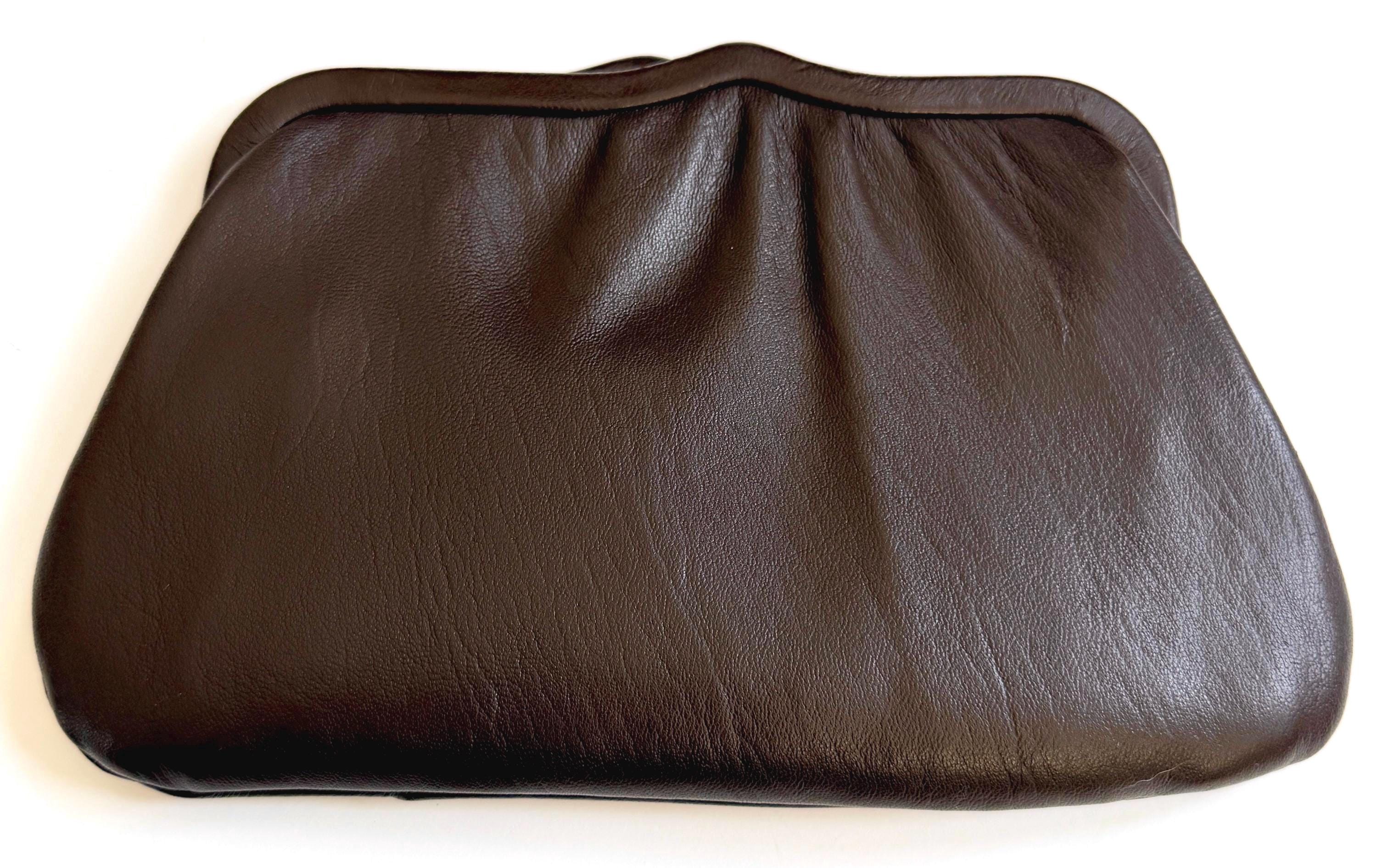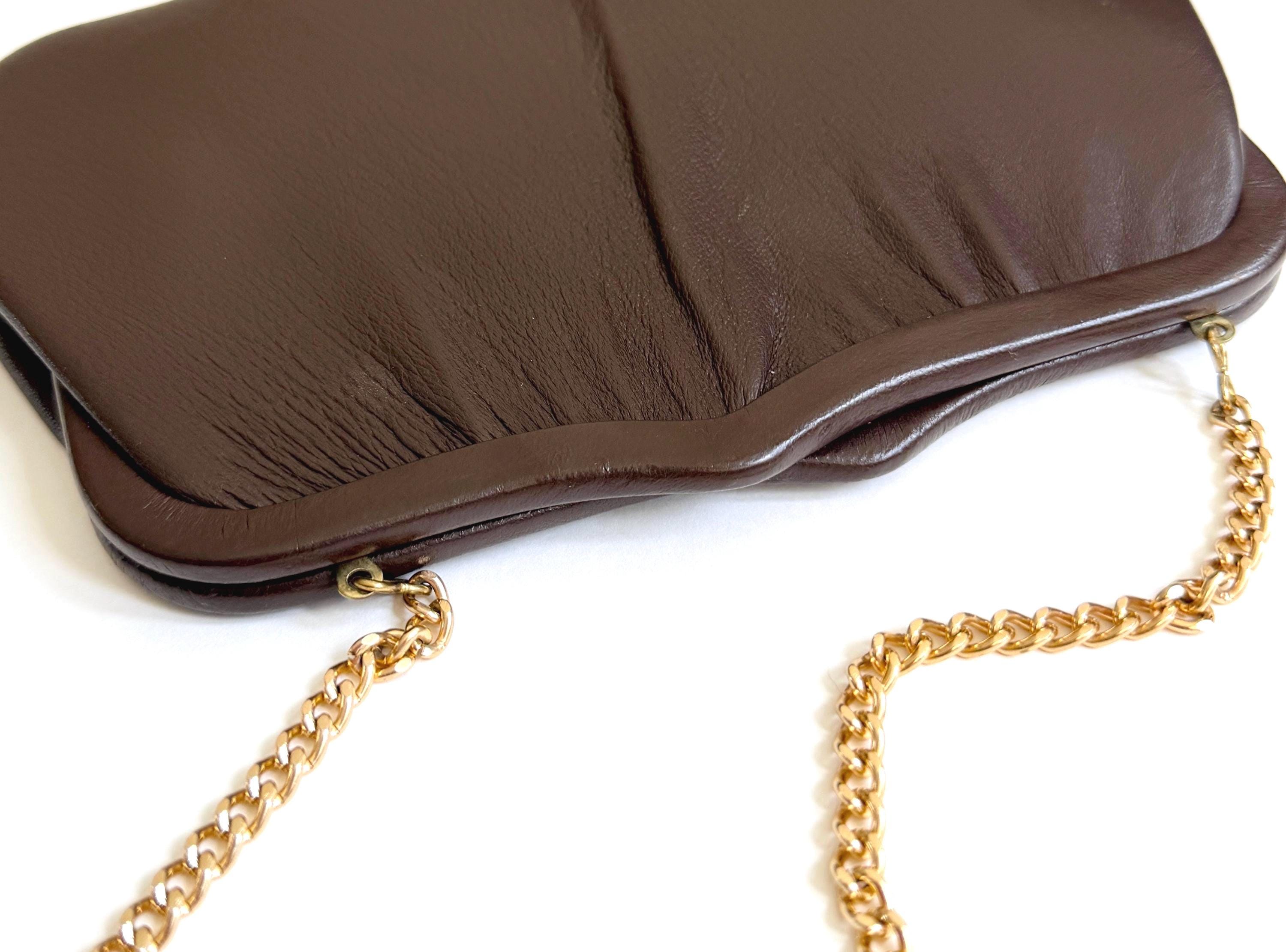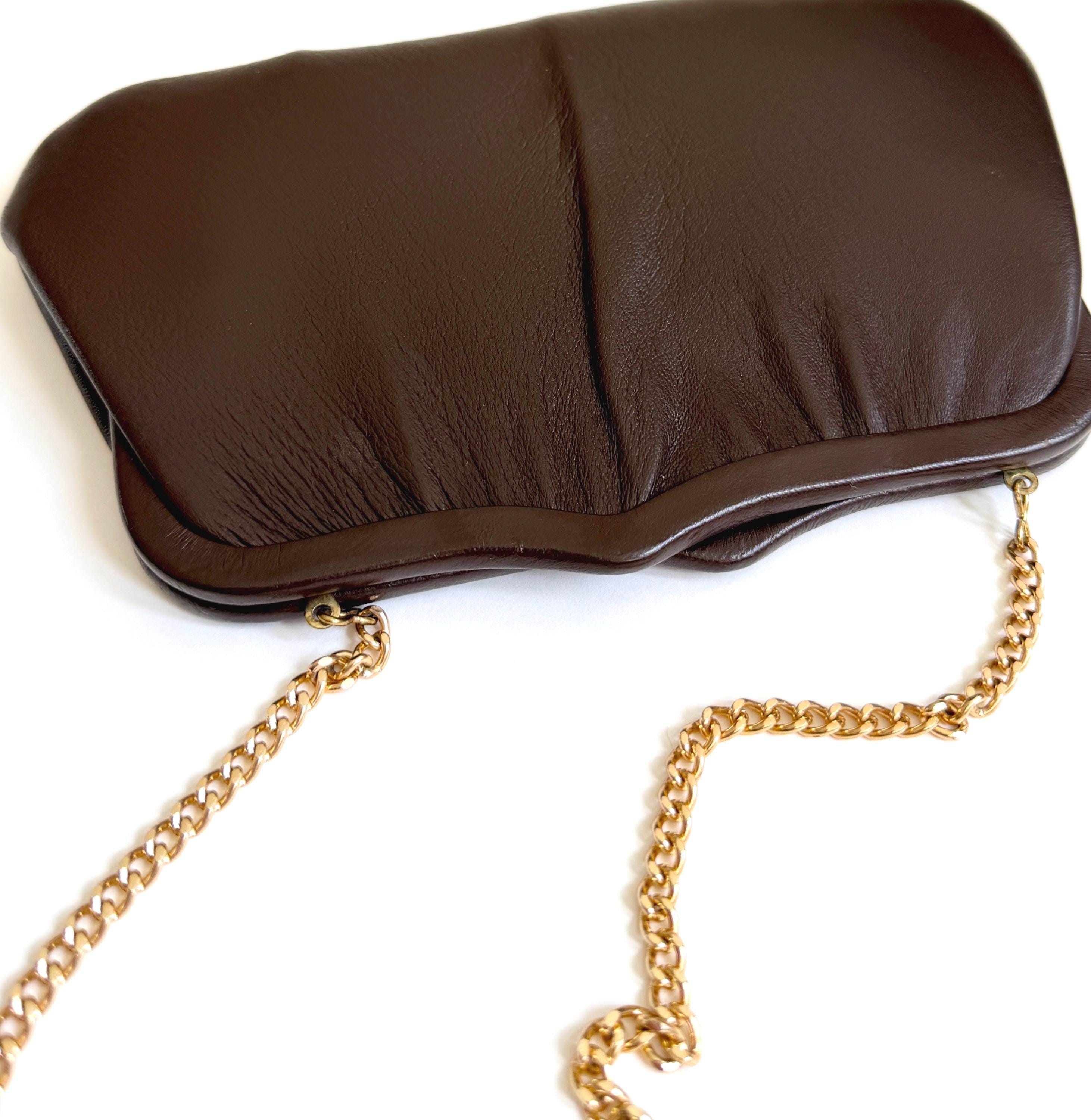 Vintage chocolate brown leather convertible bag / clutch with gold tone strap