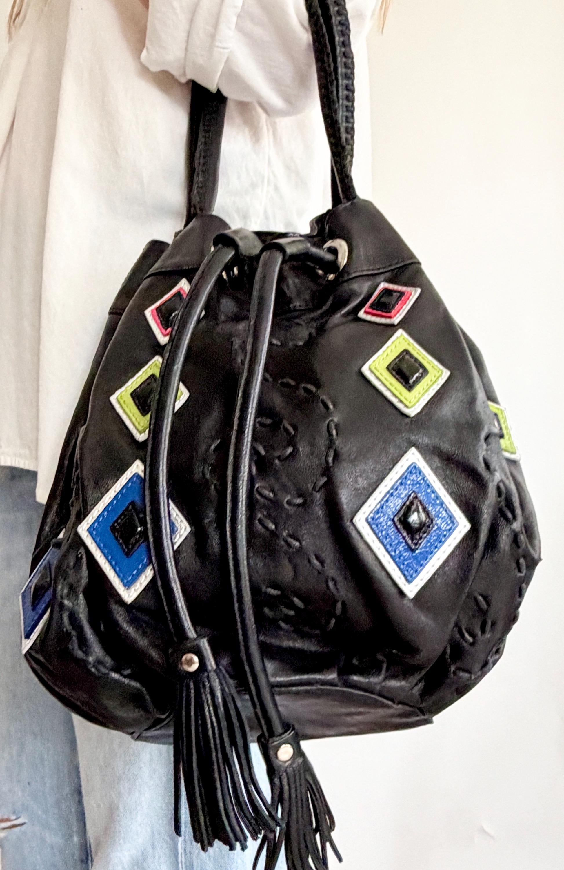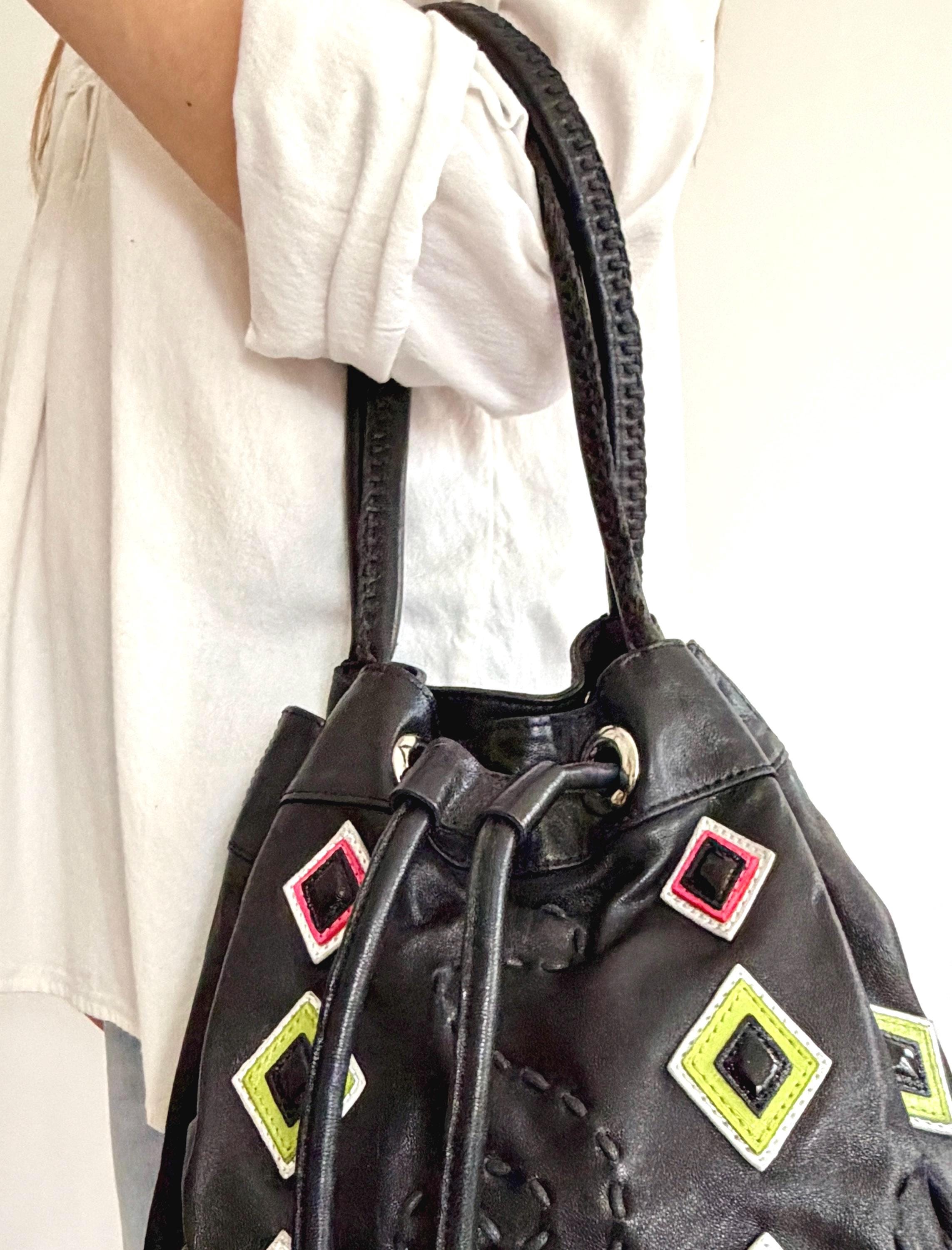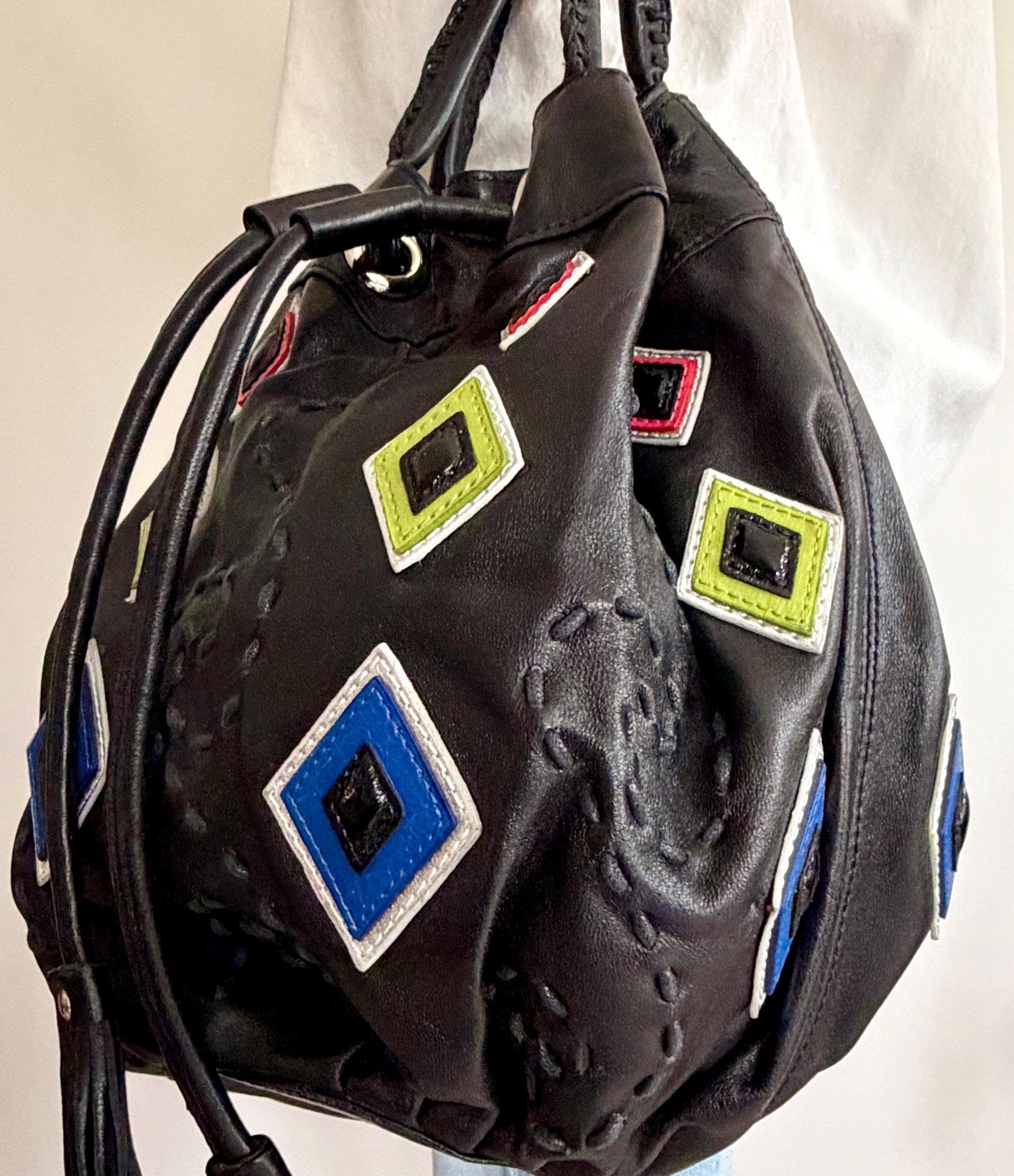 Buttery soft vintage black leather bag with drawstring closure and colorful diamond leather appliqué
