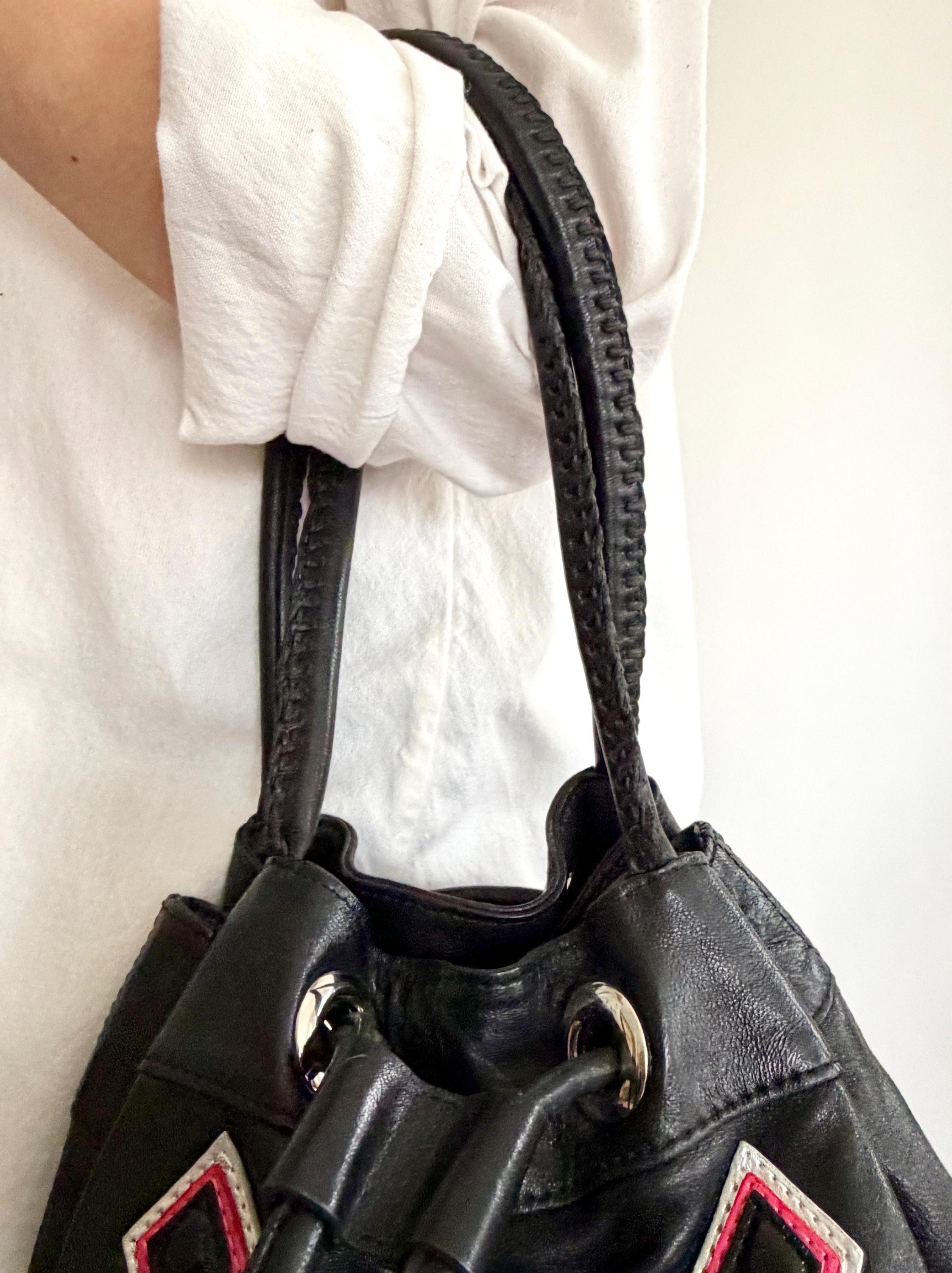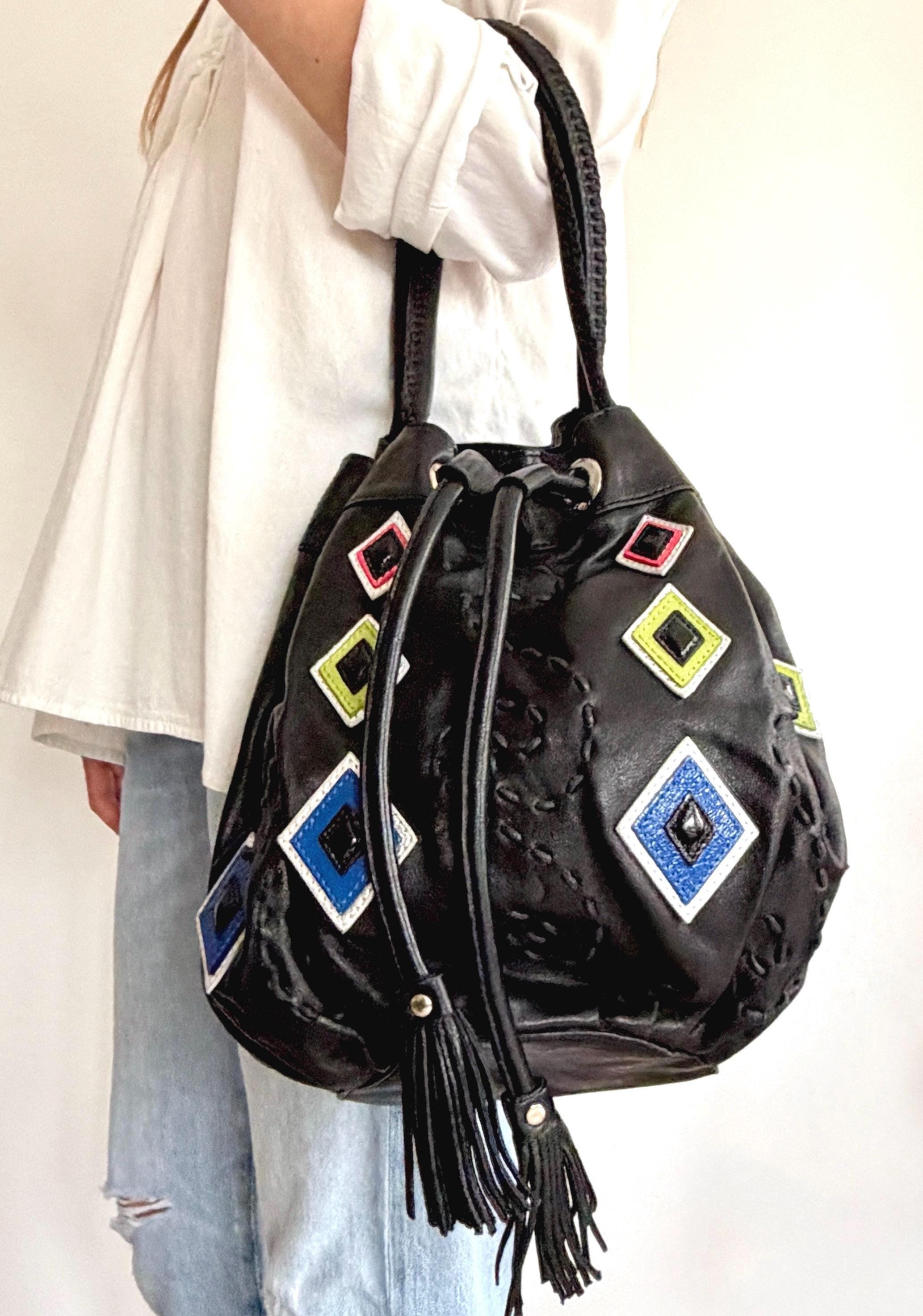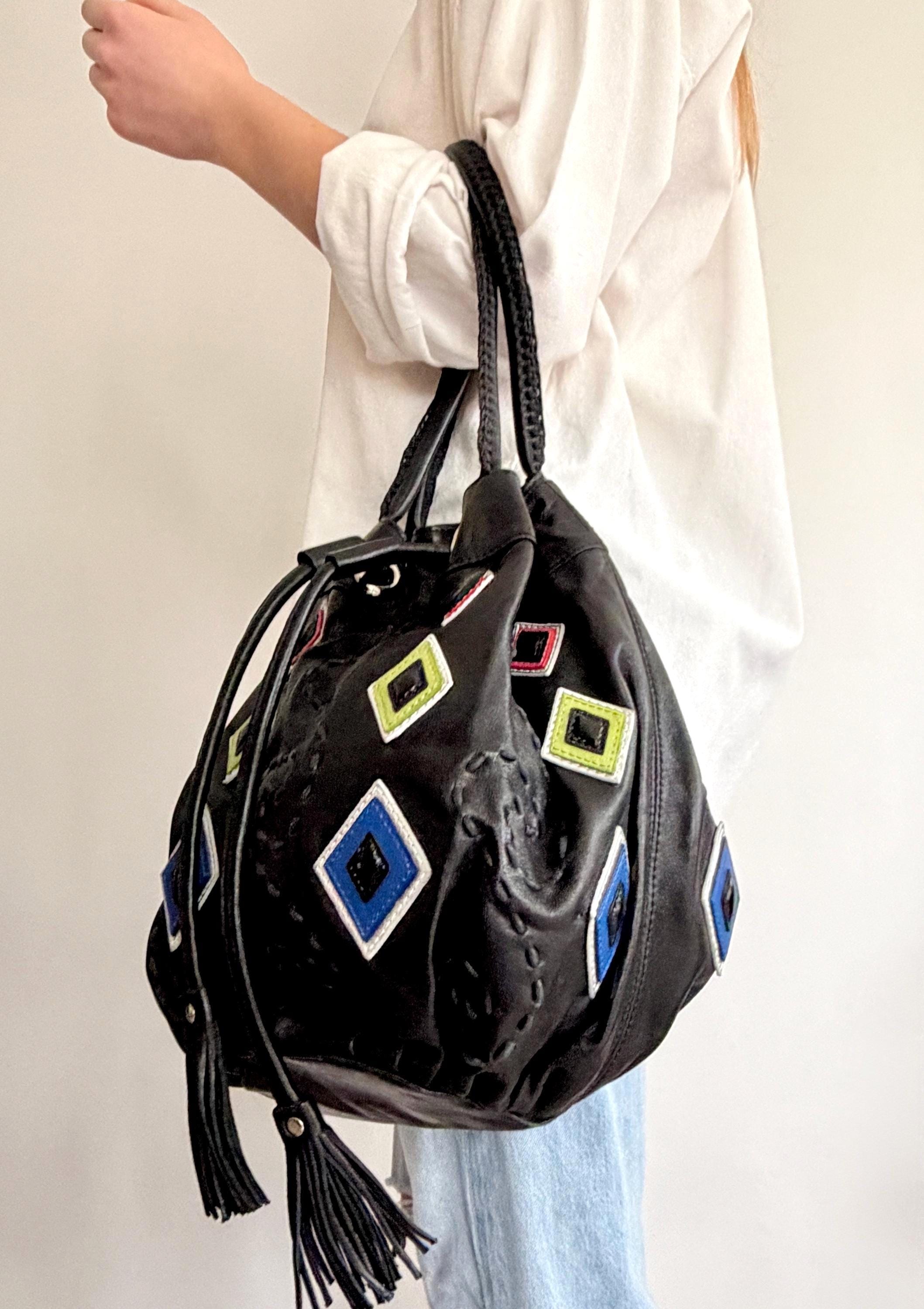 Buttery soft vintage black leather bag with drawstring closure and colorful diamond leather appliqué