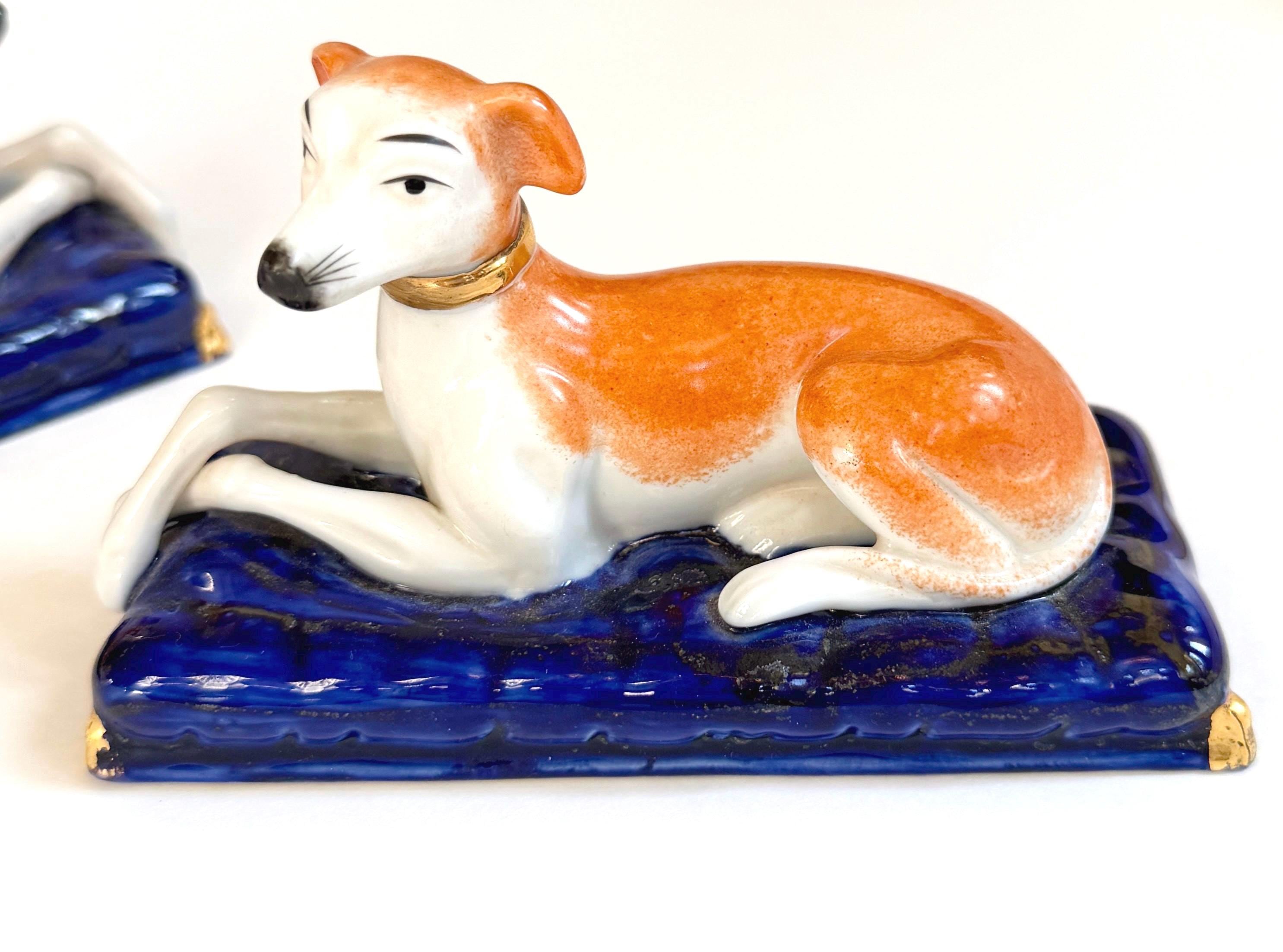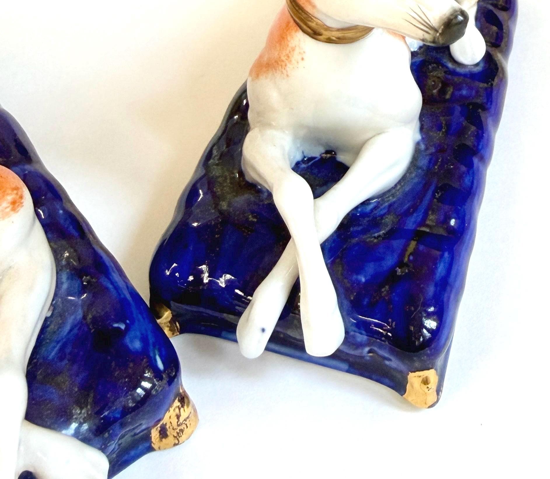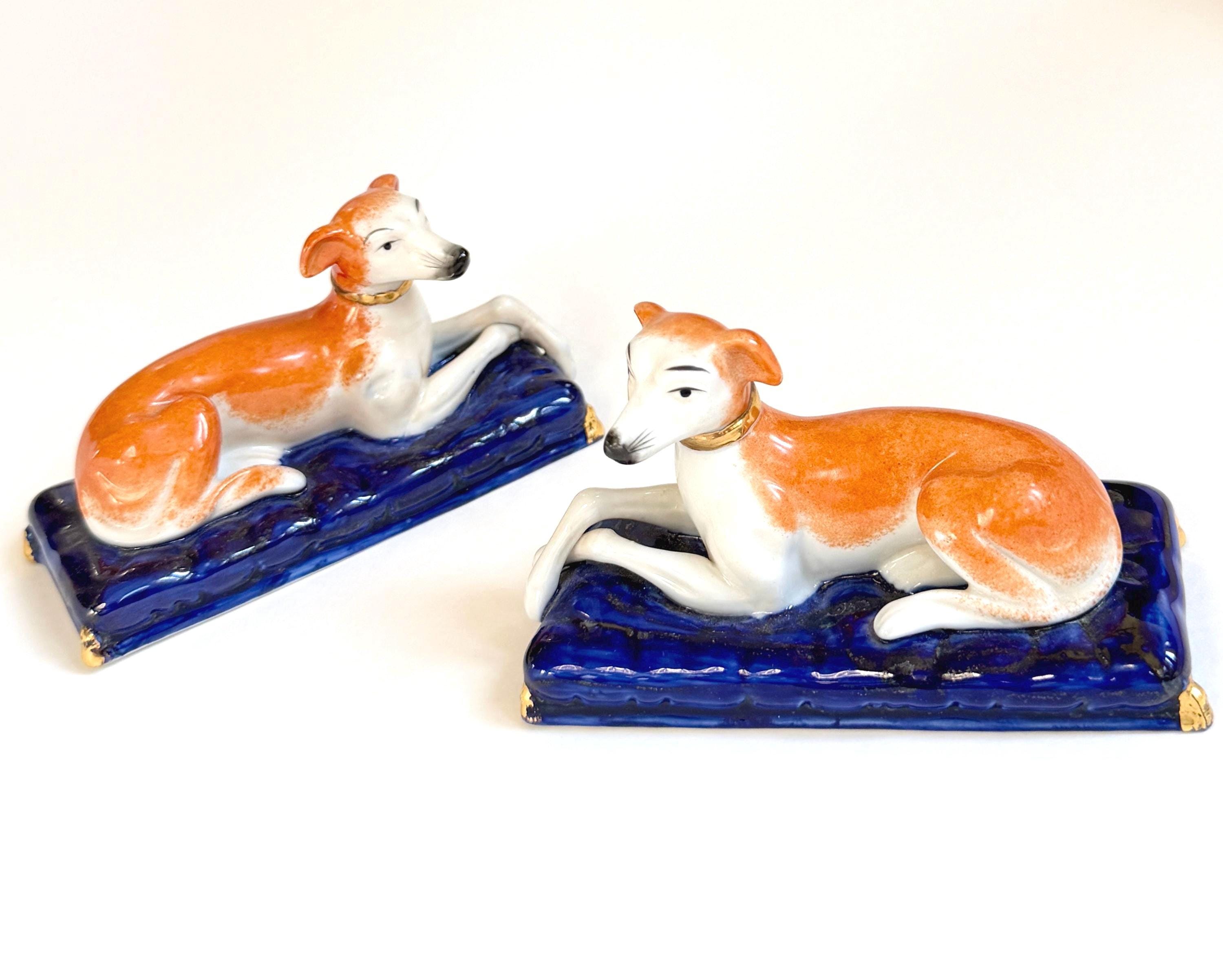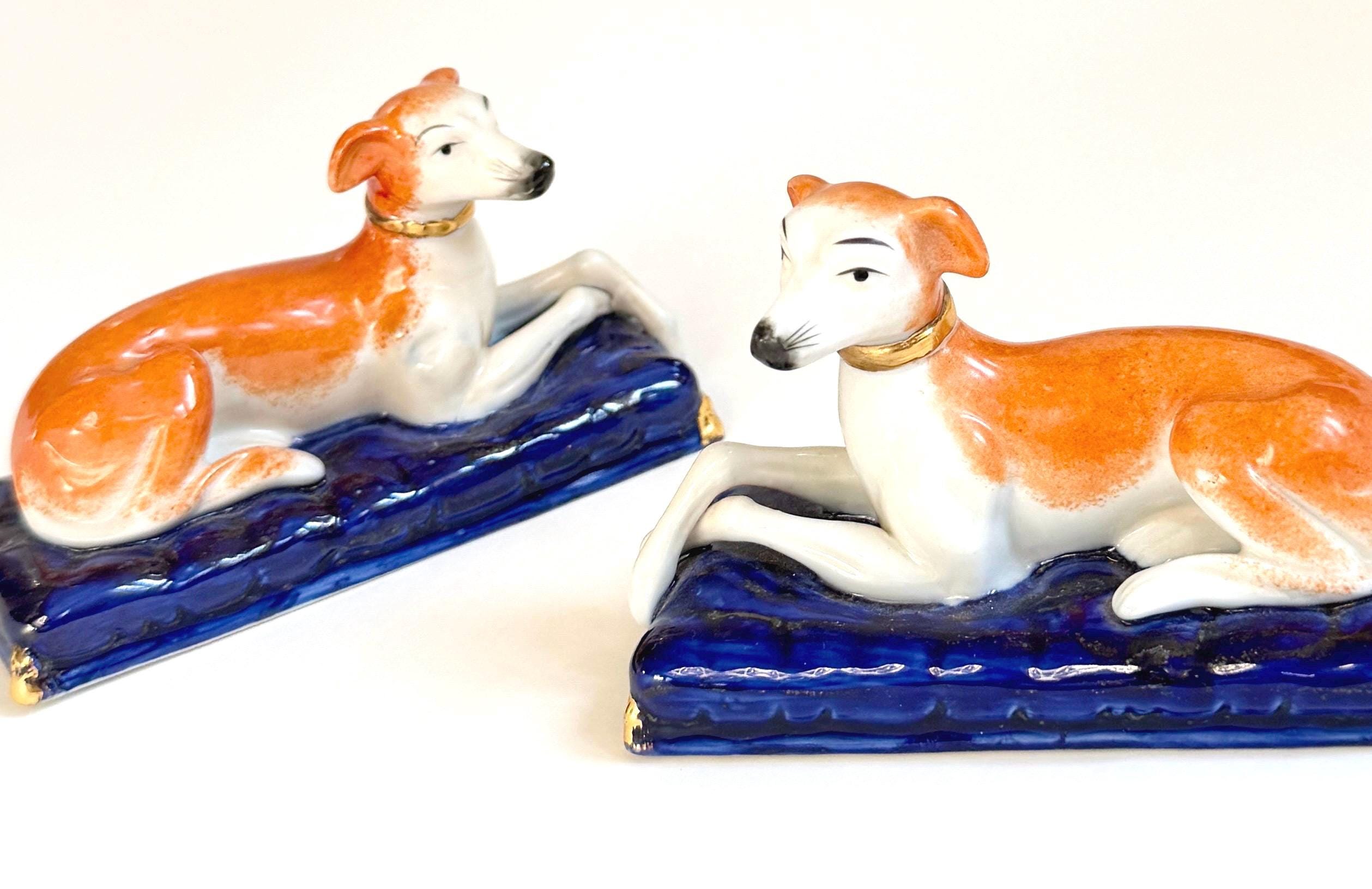 Pair of vintage ceramic laying greyhound dog figures on a cobalt blue base