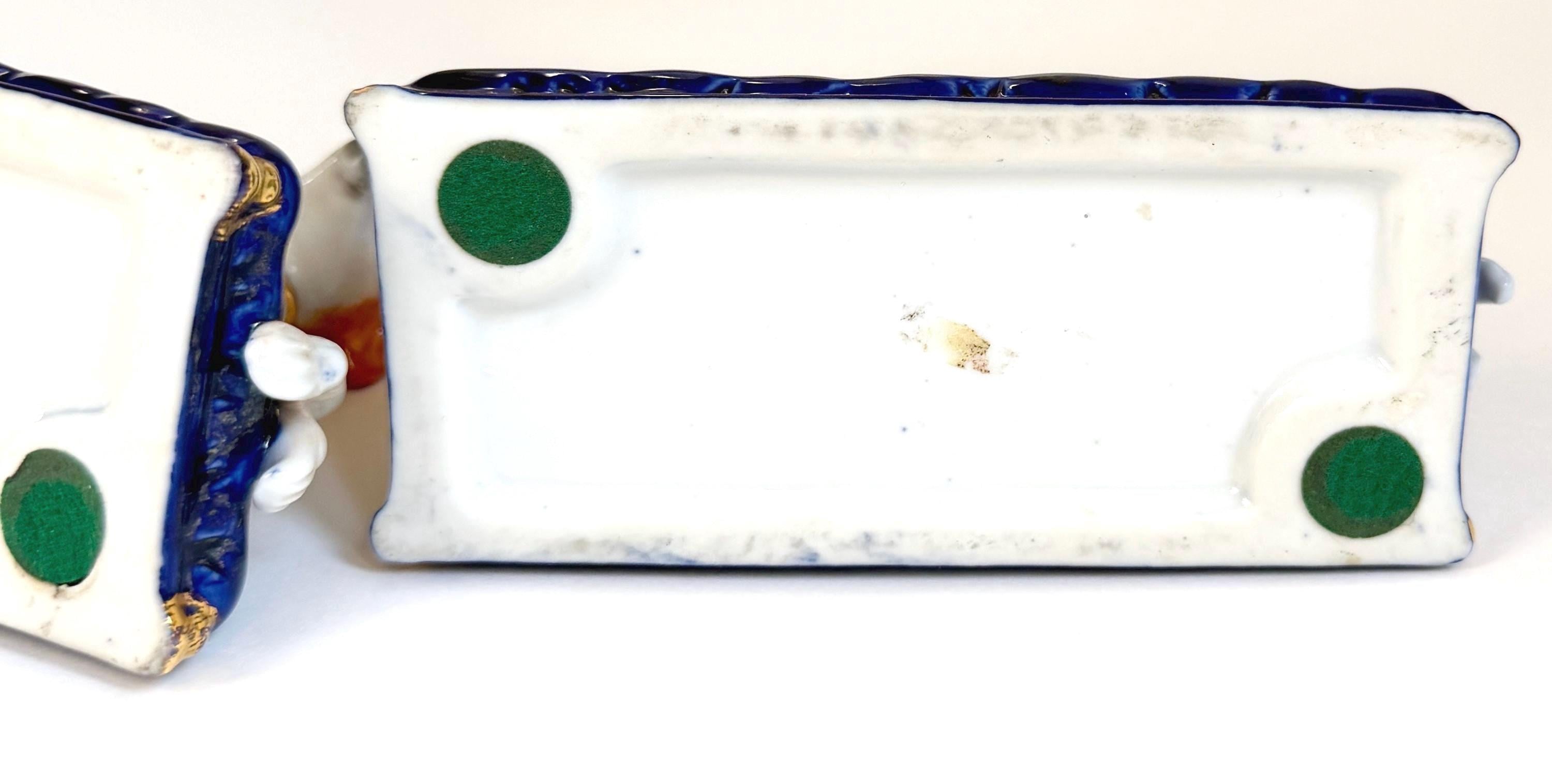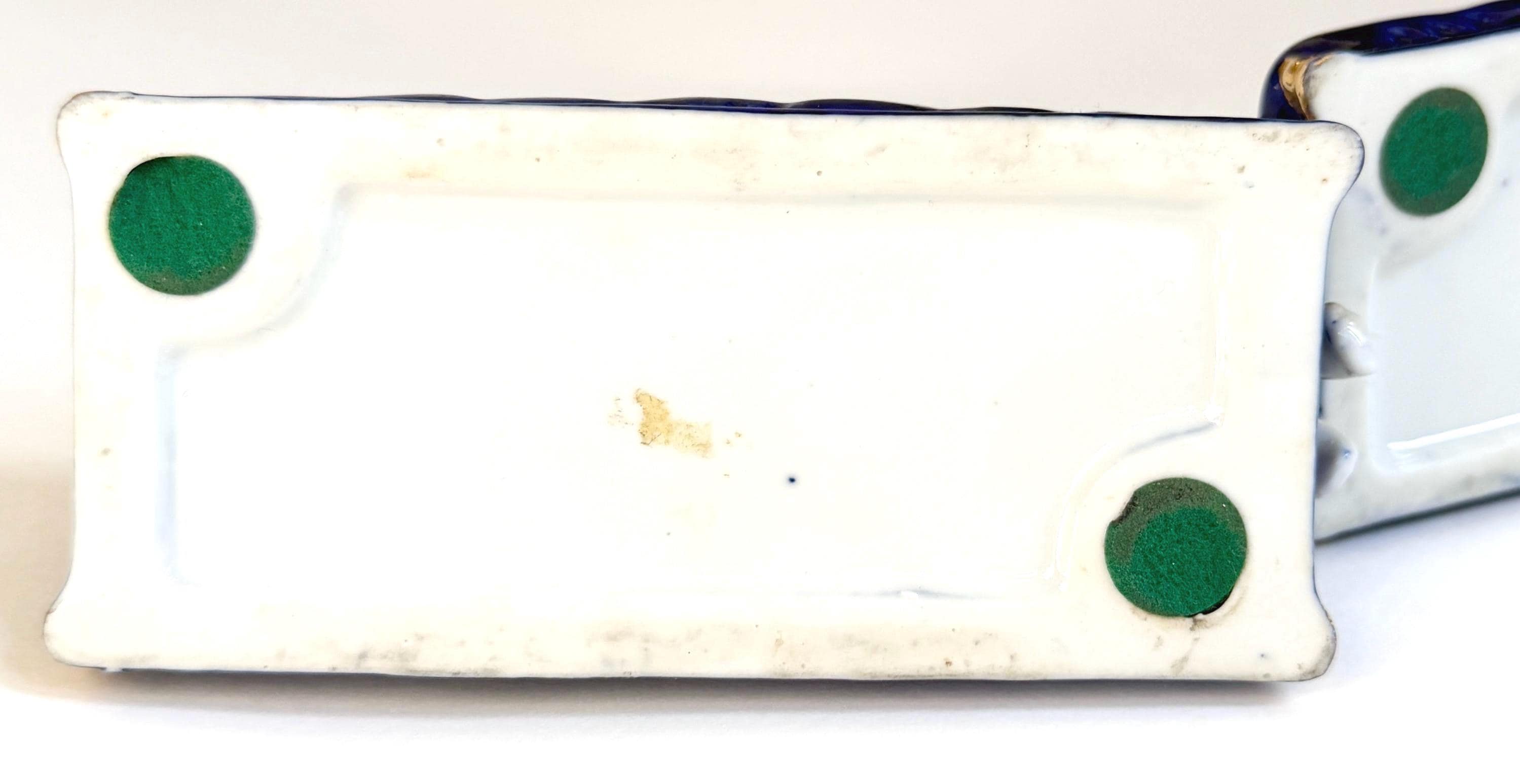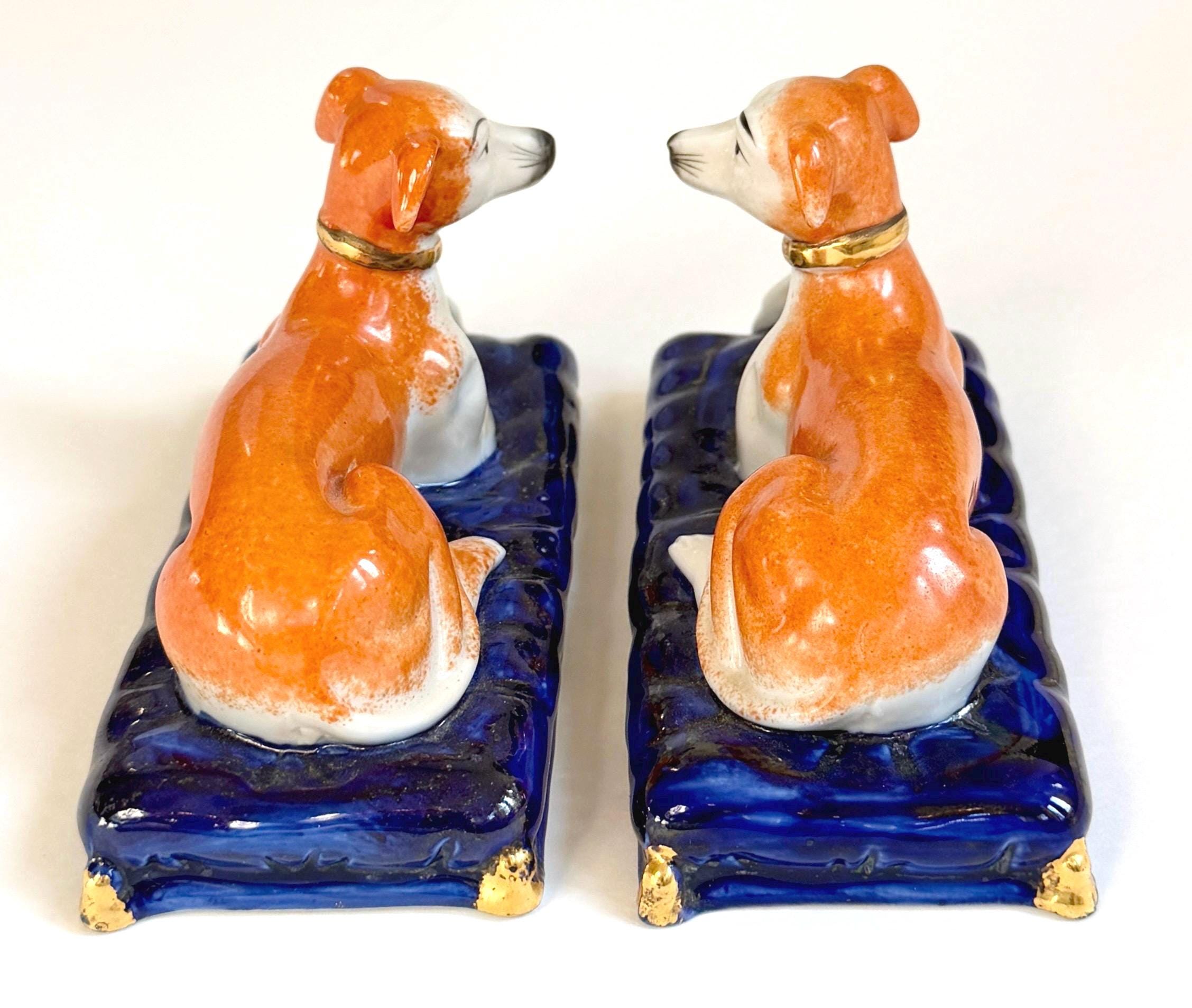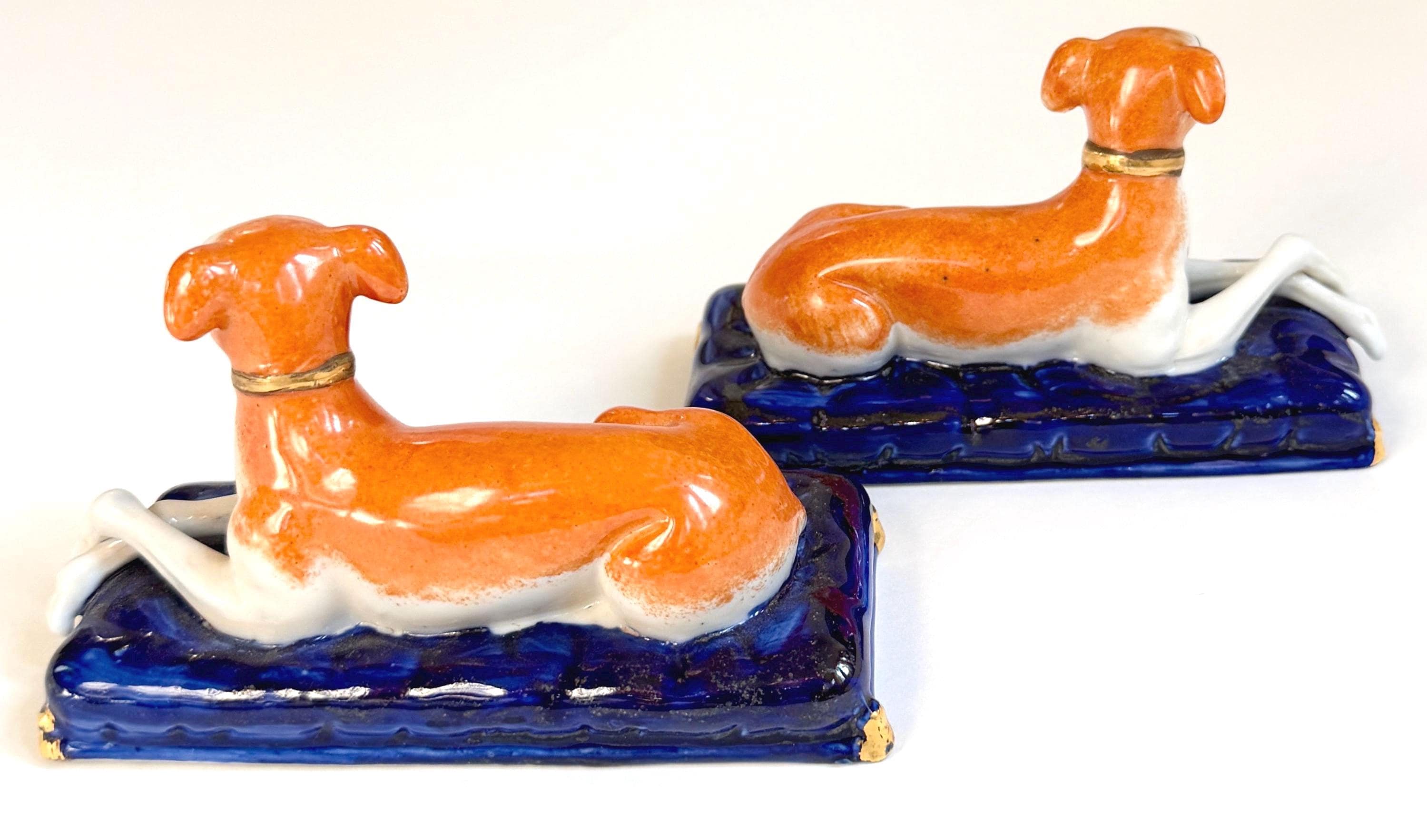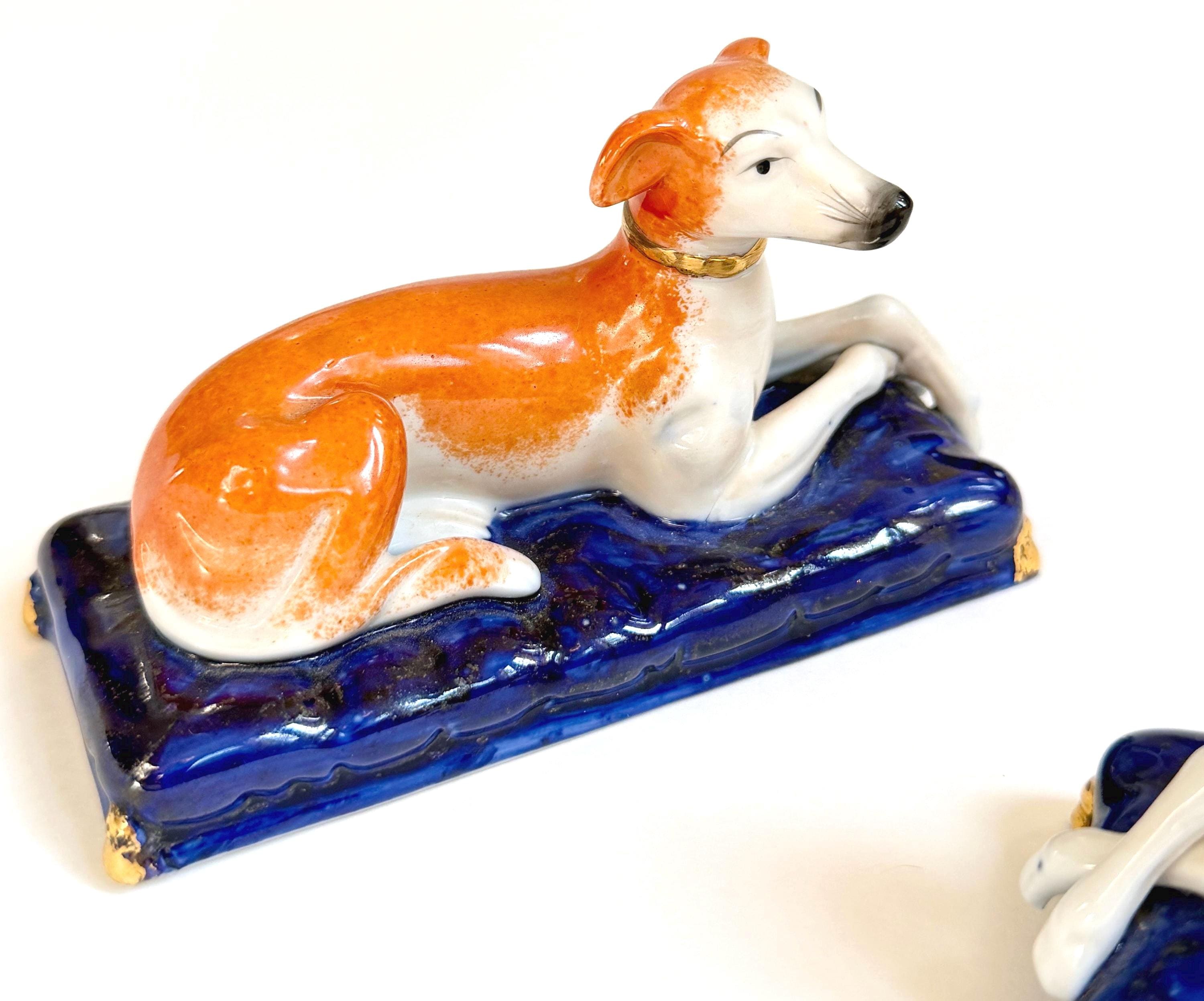 Pair of vintage ceramic laying greyhound dog figures on a cobalt blue base