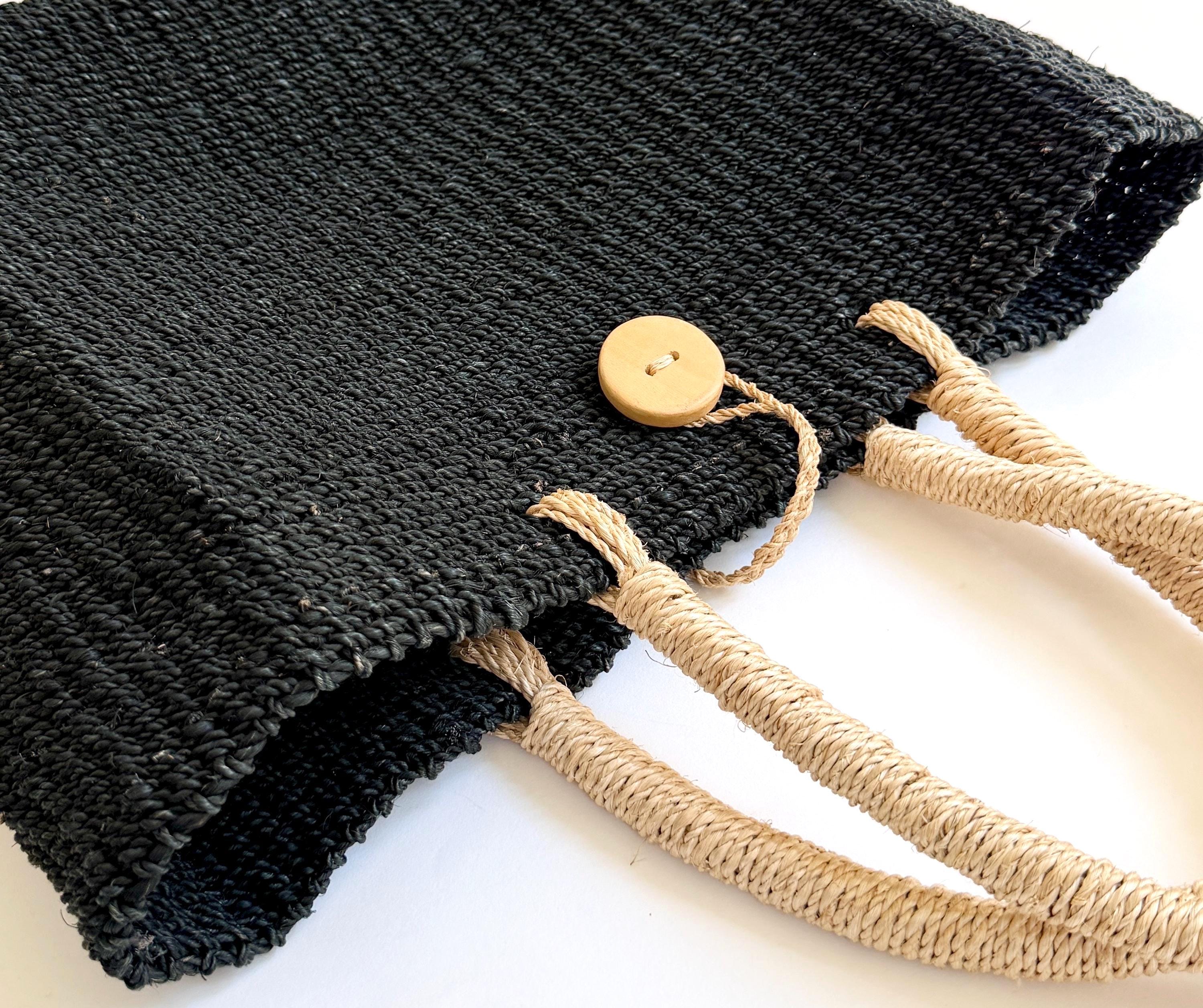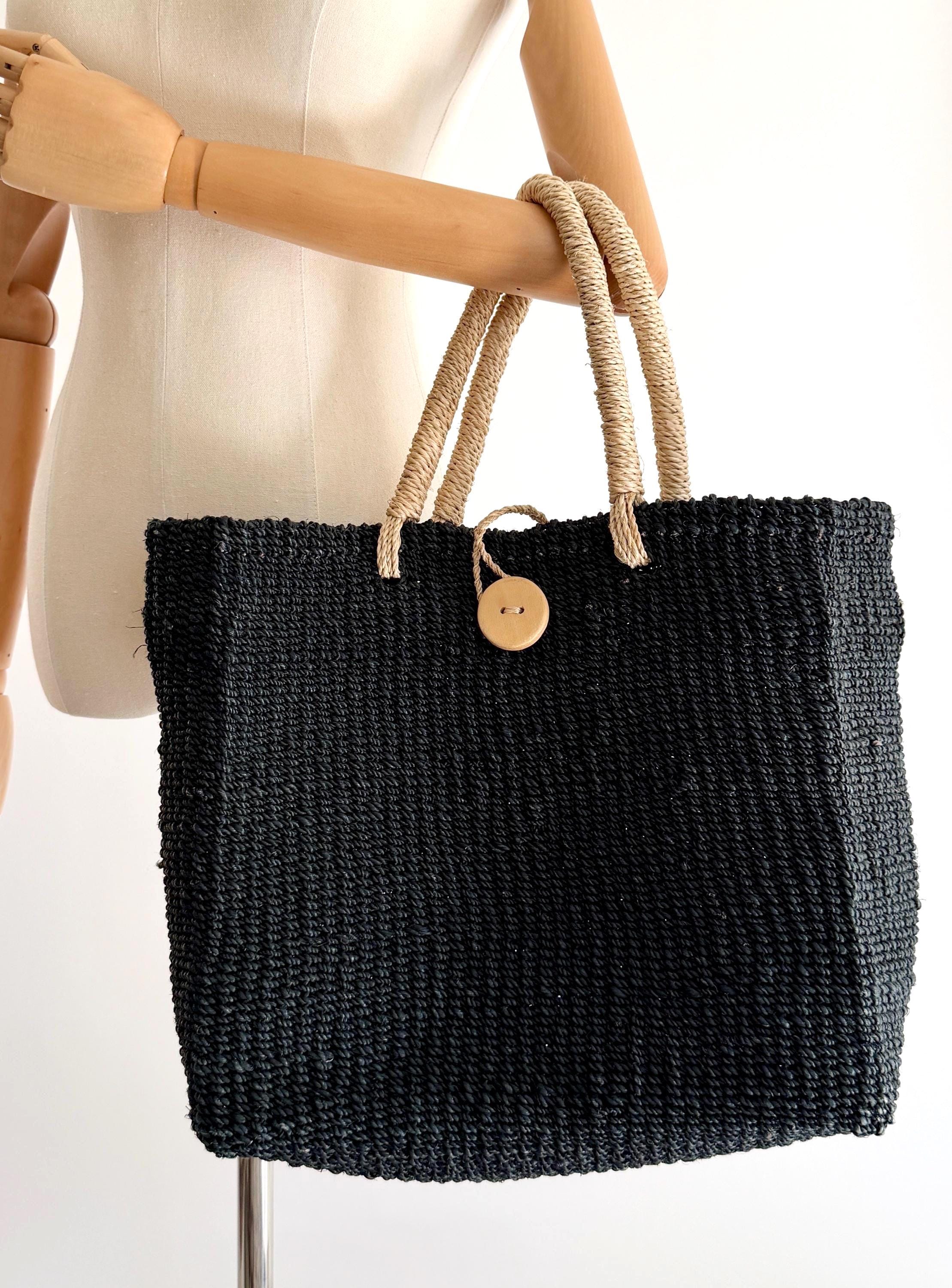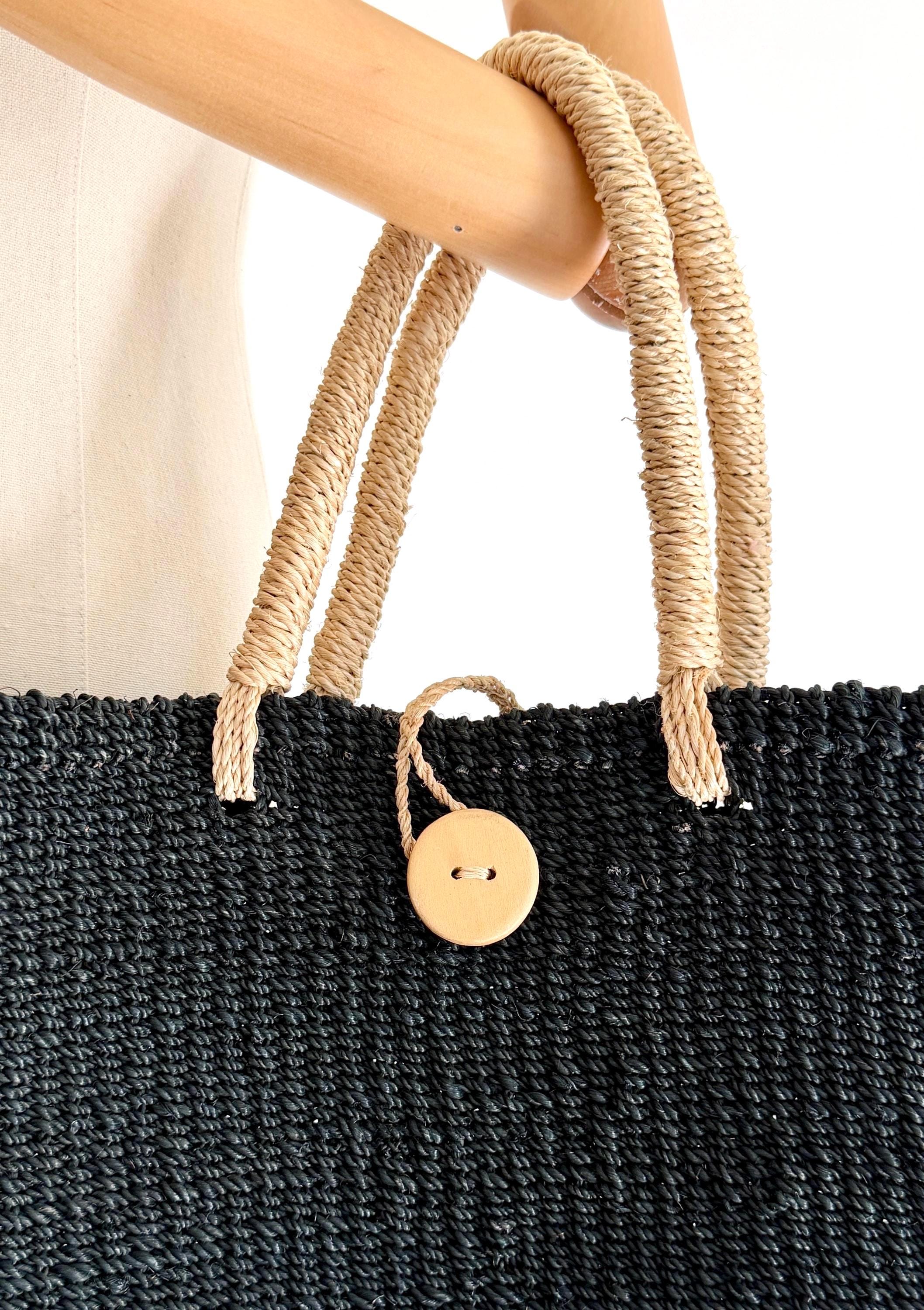 Vintage woven sisal bag with beige straps and wood bead button closure