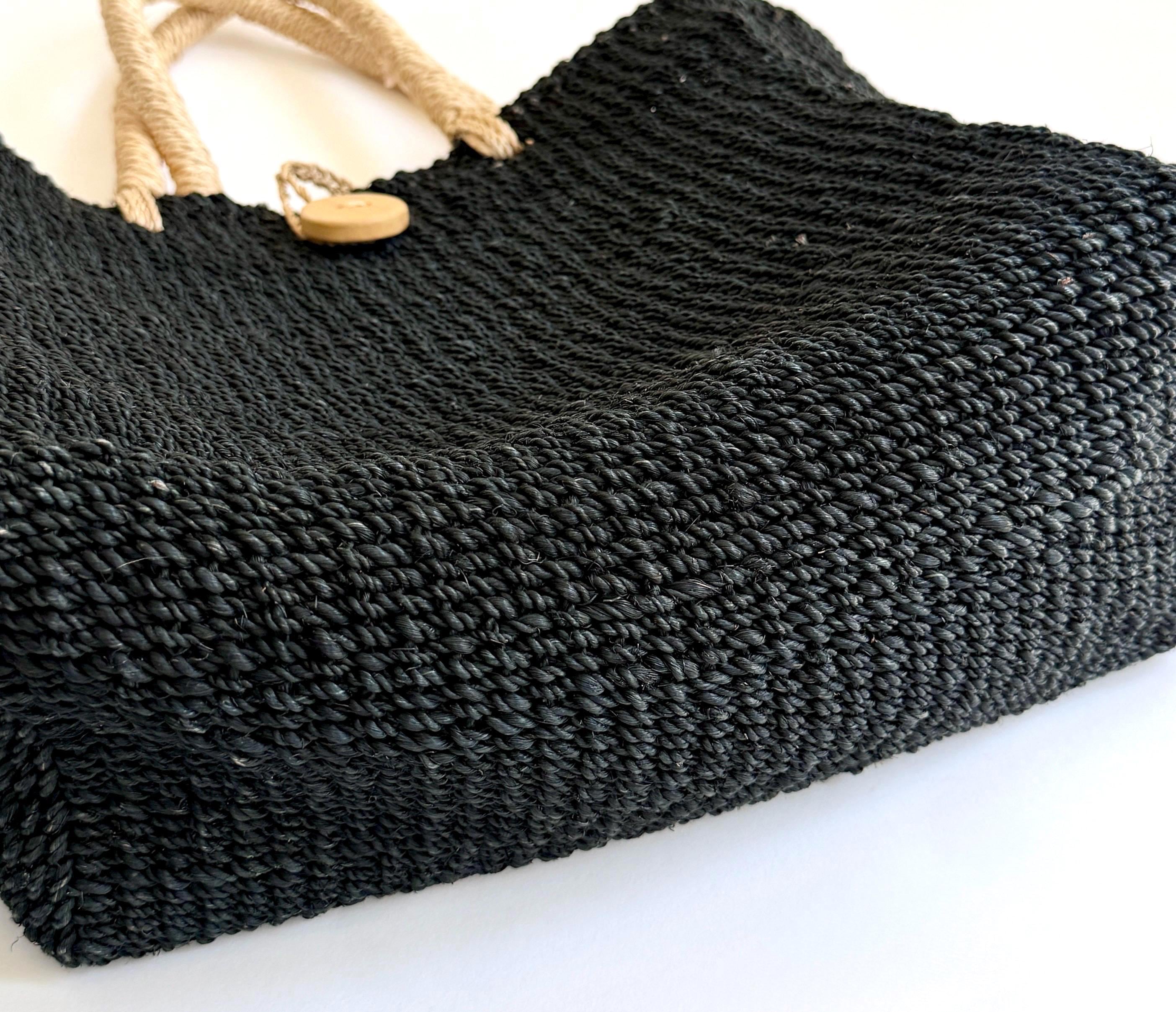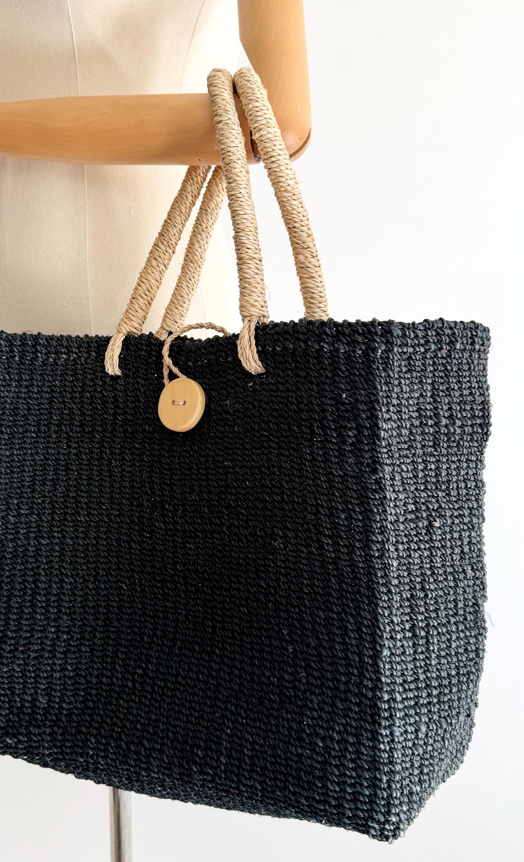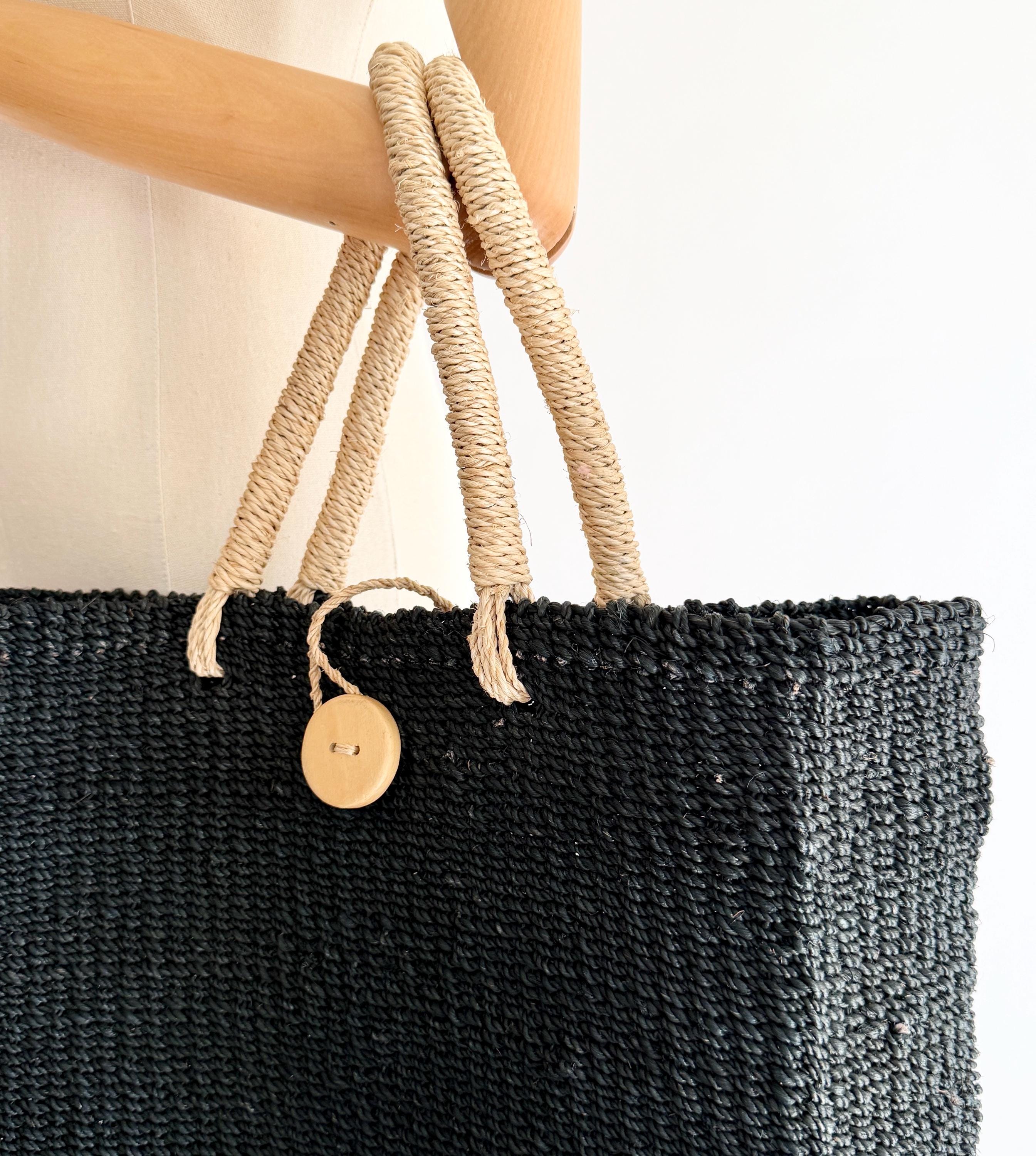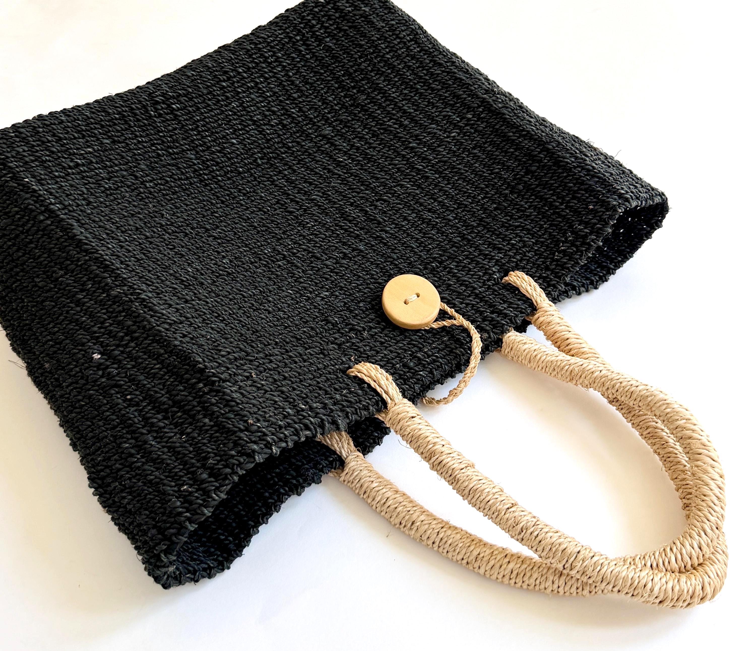 Vintage woven sisal bag with beige straps and wood bead button closure