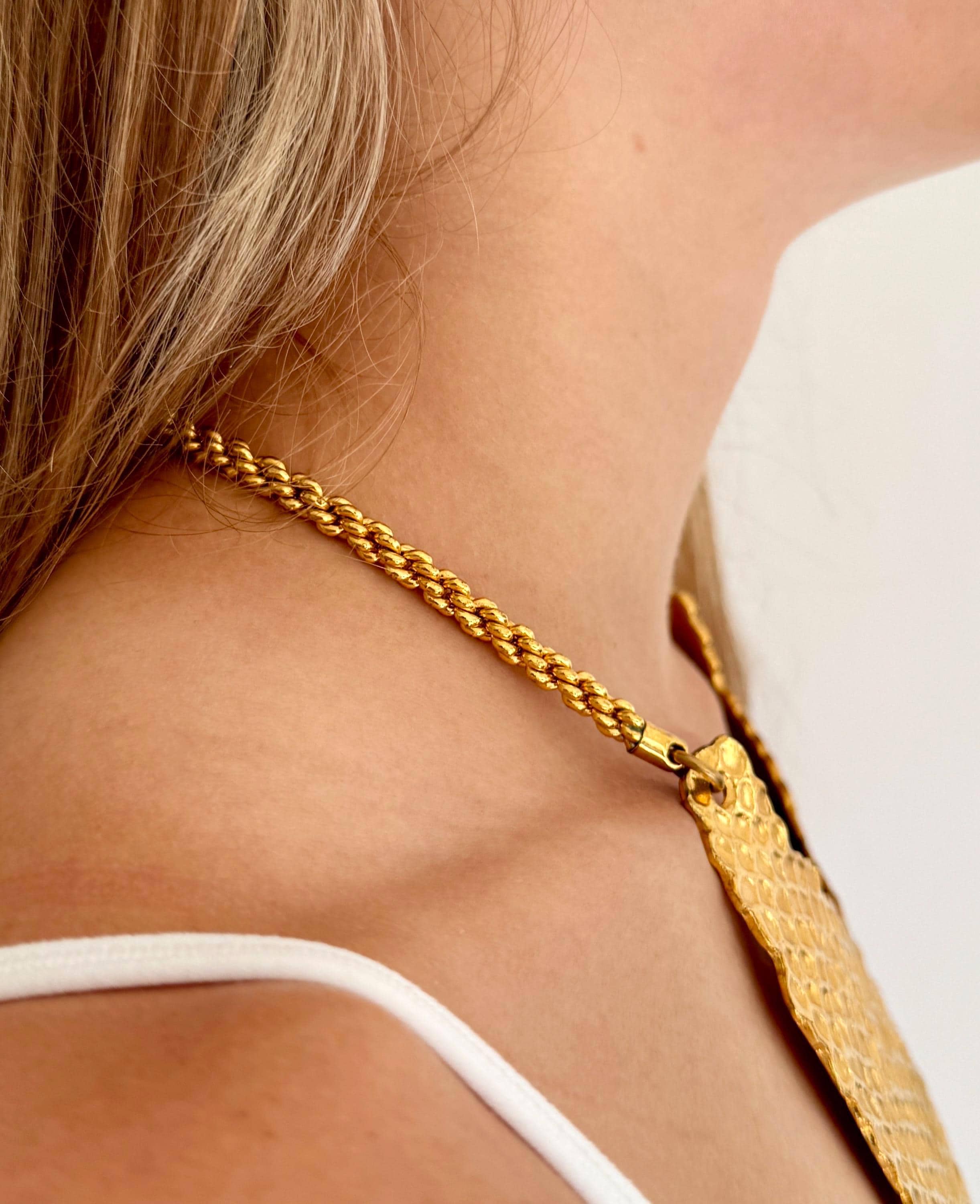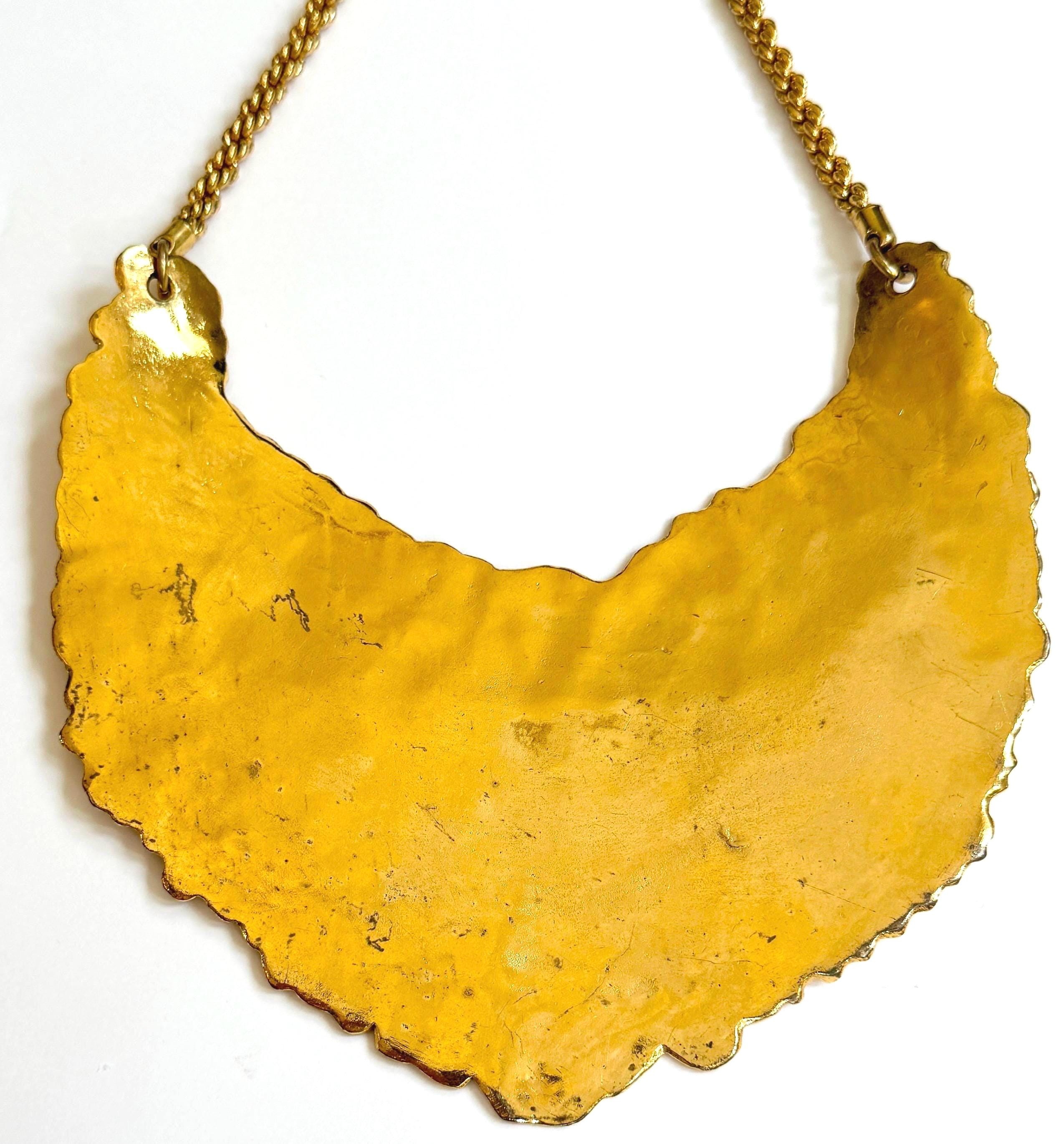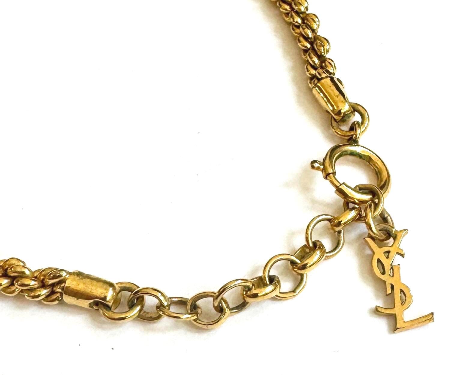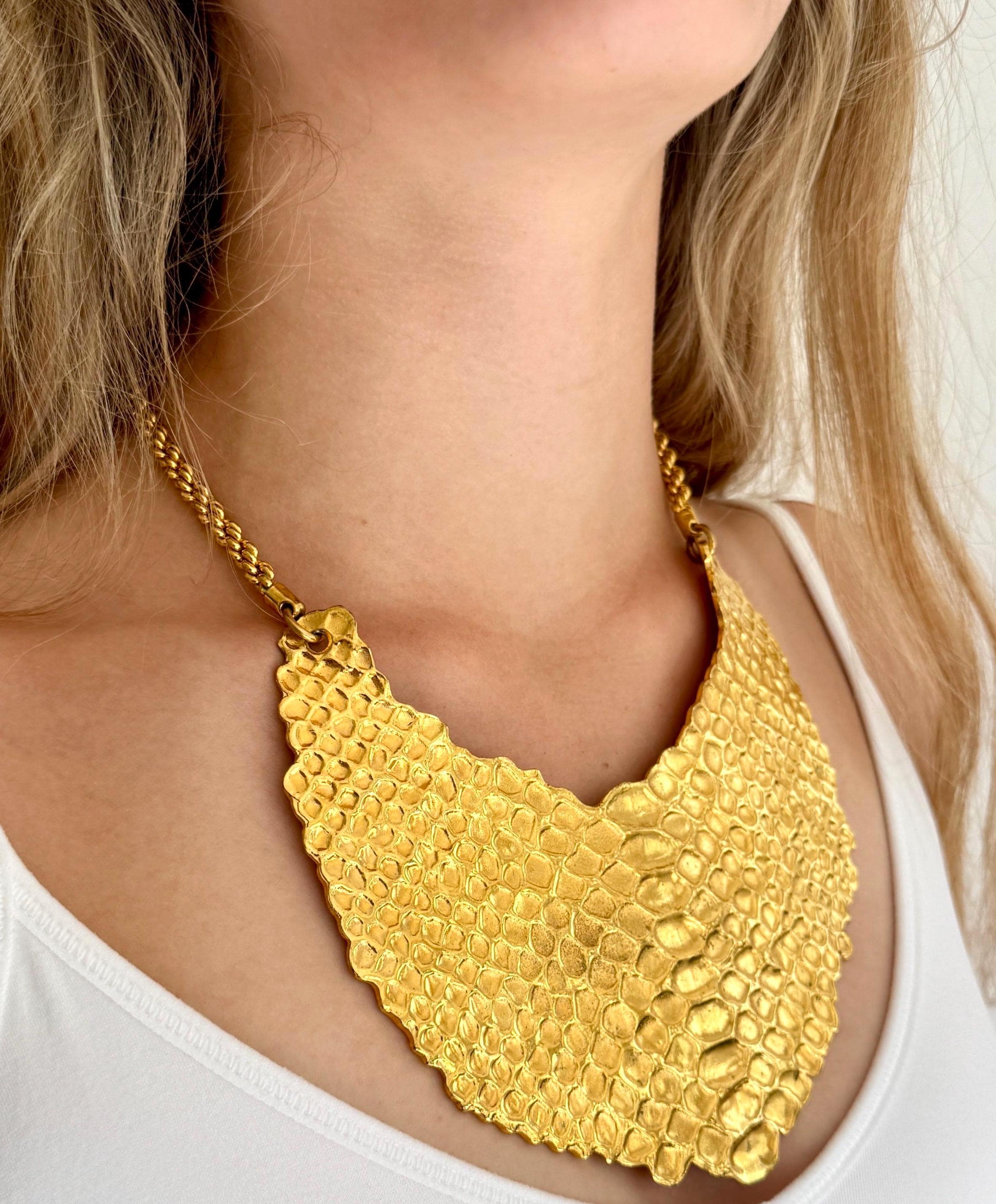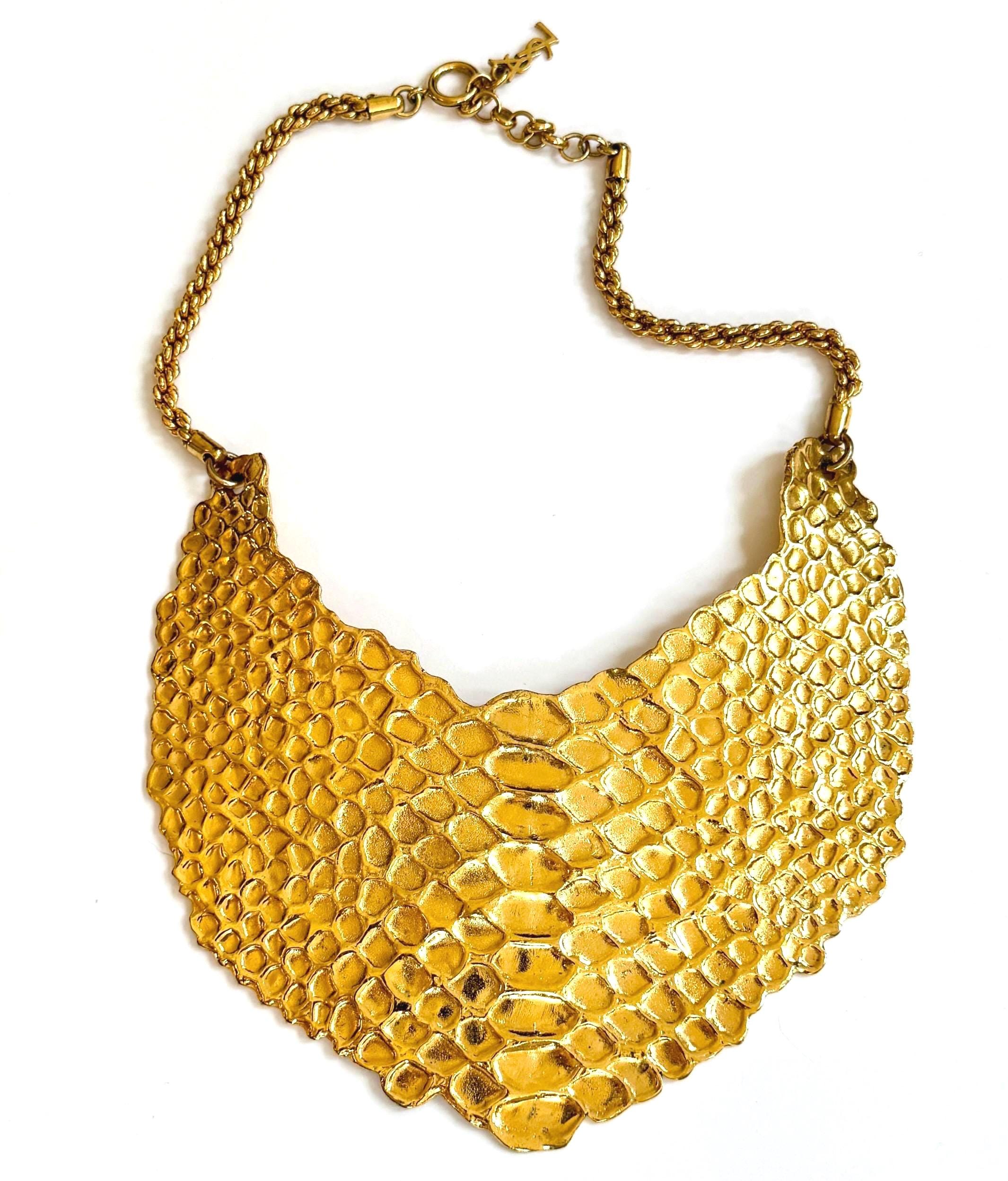 Vintage 90's Yves Saint Laurent gold tone python embossed bib necklace with YSL charm that hangs down the neck